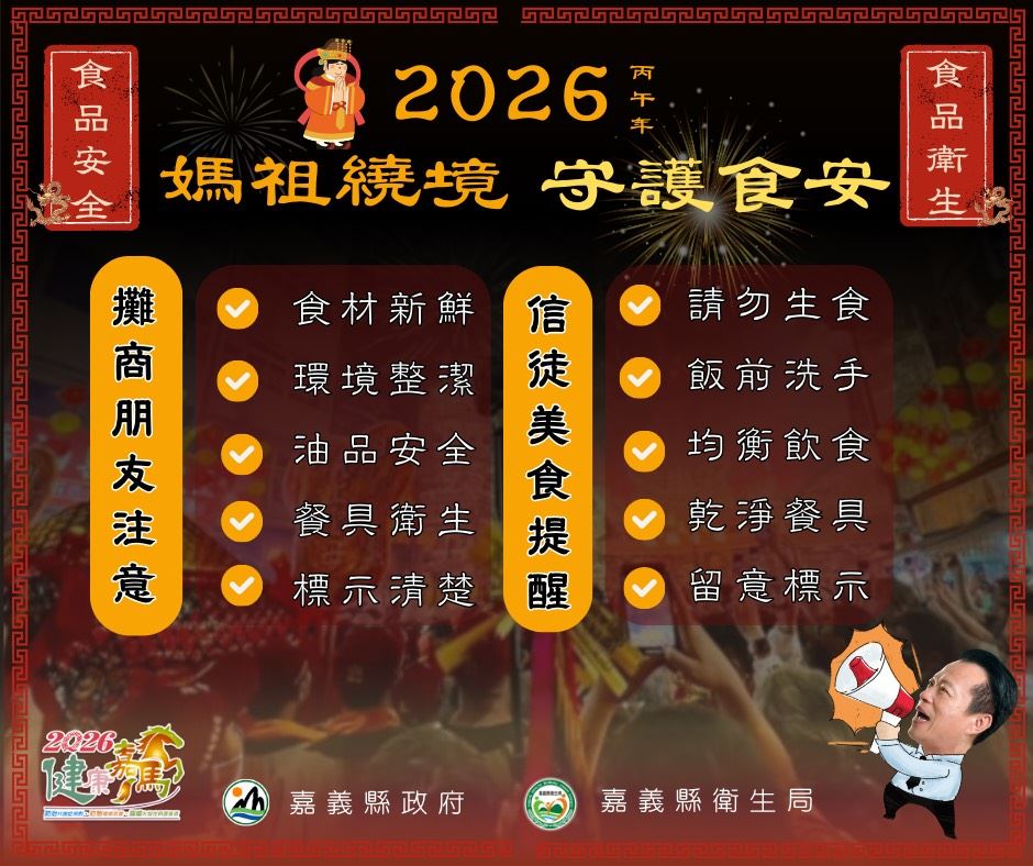 嘉義縣衛生局長趙紋華特別提醒,遶境期間常有民眾自發提供餐食供香客及信徒享用,呼籲熱心供餐民眾應落實預防食物中毒五要原則:處理餐食過程要確實洗手、要選新鮮食材、要生熟食分開、要澈底加熱及要注意保存溫度,並避免提供隔餐食品,以降低食物中毒風險,確保飲食安全。