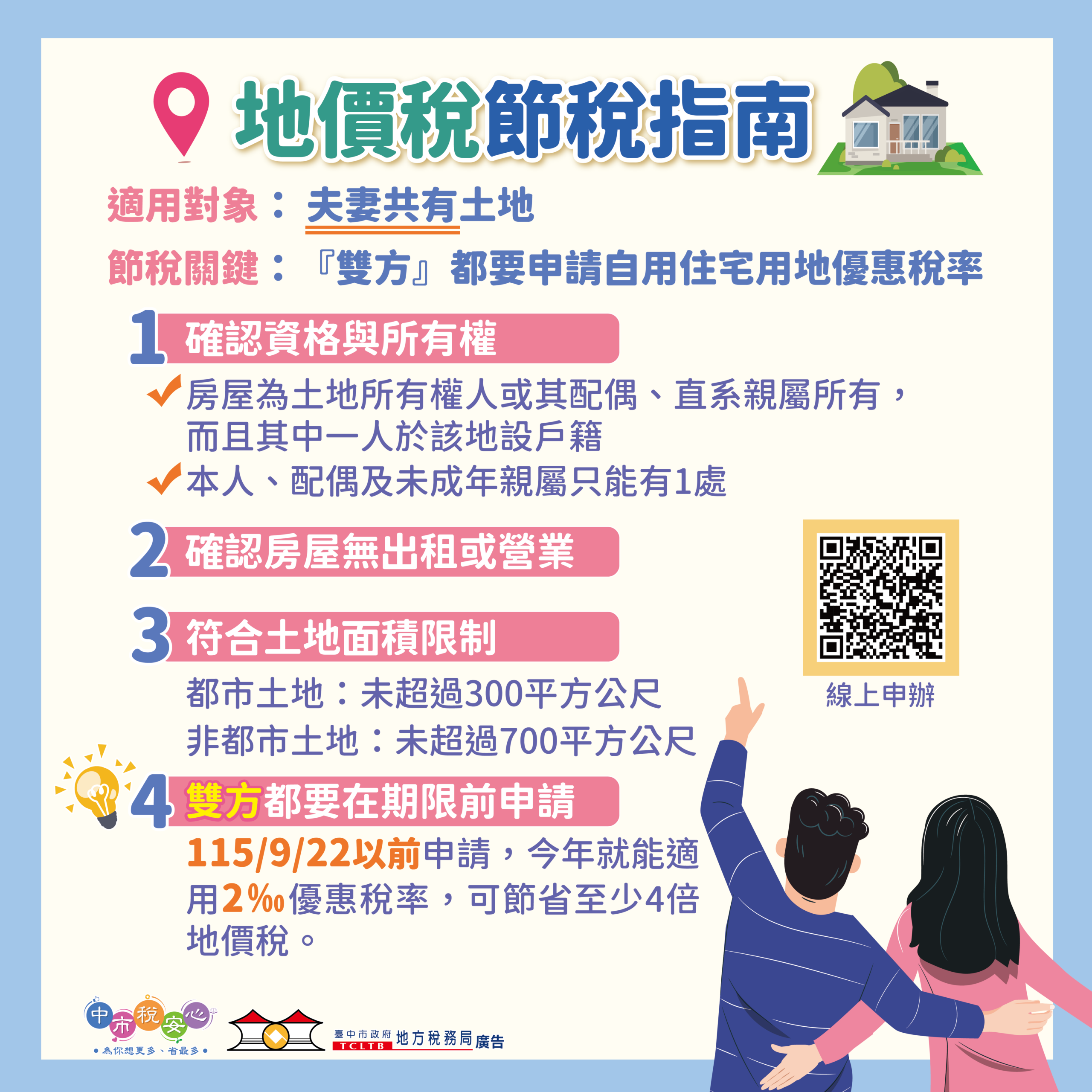台中市政府地方稅務局近日受理「地價稅自用住宅用地優惠稅率」申請時,發現民眾因誤解「1處」規定,差點錯失節稅權益。地稅局指出,一位南屯區陳先生與太太共同持有1筆土地,原以為夫妻僅能由1人提出申請,因此僅由陳先生辦理,未將太太名下持分一併申請。稅務人員審查時發現並主動致電提醒,協助釐清規定並完成夫妻雙方申請,讓陳先生大讚地稅局服務專業又貼心。