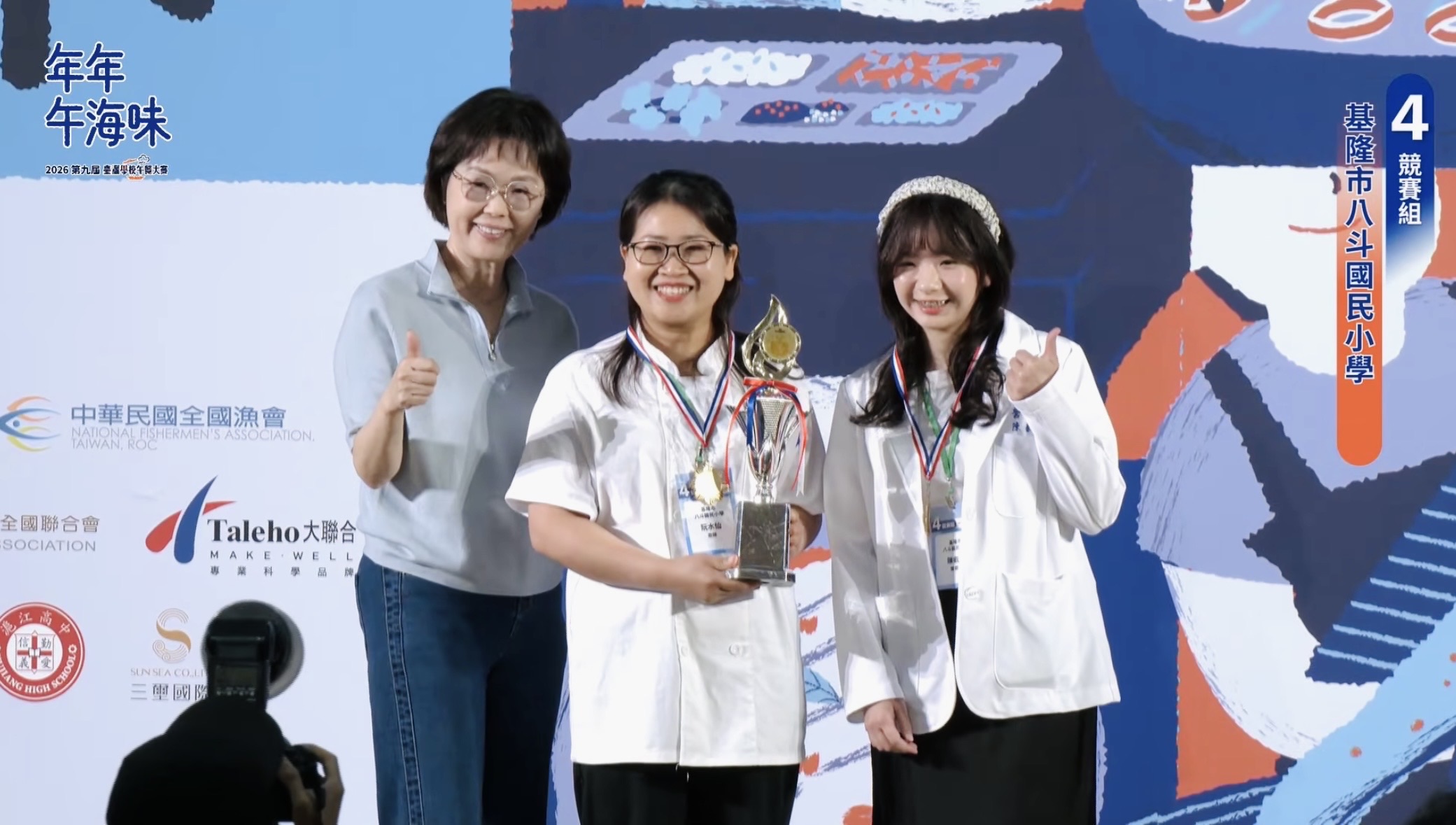 大享食育協會於4月18-19日舉辦「2026年第9屆臺灣學校午餐大賽-年年午海味」共9個縣市12之隊伍晉級決賽,其中代表基隆市晉級決賽的是八斗國小陳叡霖營養師及阮水仙廚師。
