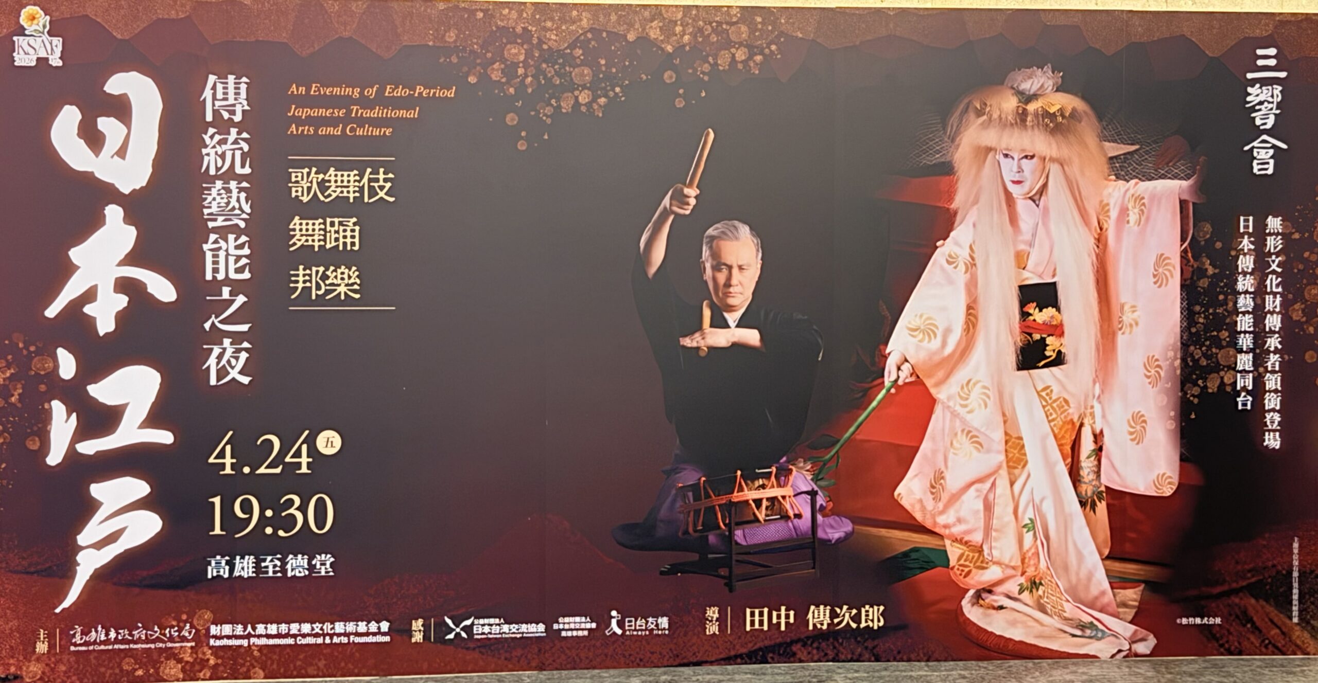 2026年高雄春天藝術節將呈獻年度最受矚目的國際節目-《日本江戶傳統藝能之夜:歌舞伎•舞踊•邦樂》,4/24(五)明天晚上19:30 將在高雄文化中心至德堂震撼登場,本場演出是由日本古典藝能音樂代表性的藝能名門-「三響會」成員、同時也是重要無形文化財綜合指定保存者的田中傳次郎親自為高雄春天藝術節策劃、執導並領銜演出。高雄市政府文化局表示:「本次演出內容涵蓋日本江戶時期蓬勃發展之傳統藝能及其深厚文化底蘊,包括歌舞伎音樂與舞蹈、日本傳統舞踊、和太鼓、津輕三味線以及居合道演武。透過歷經時代淬鍊的藝能精粹,細緻呈現跨越世代的文化記憶與美學積累;誠摯邀請喜愛日本傳統藝能的觀眾走進劇場,親身感受其內在精神與傳統藝術所蘊藏的極致之美。」。