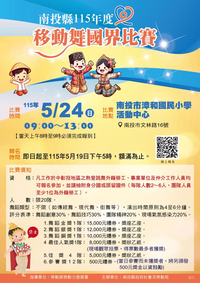 本活動獎項非常豐厚,活動獎項最高1萬5千元禮劵,總獎金額高達7萬1千元,歡迎有興趣之移工朋友踴躍報名參加,也鼓勵雇主及仲介單位協助推薦與參與,並一同賞舞及投票給予參賽者支持,共同打造一場充滿熱情與國際風情的舞蹈盛會。報名方式採網路報名,自即日起開放報名至115年5月19日下午5時止,額滿即提前截止,相關各國語言比賽簡章請掃QR CODE或至南投縣政府社會及勞動局社會福利資訊網「社會及勞動局社會福利資訊網-勞工福利-外國人工作管理-移工活動/其它」下載(網址: https://welfare.nantou.gov.tw/1486/24-5)。詳細活動訊息請電洽南投縣政府社會及勞動局勞工行政科049-2238670陳小姐。