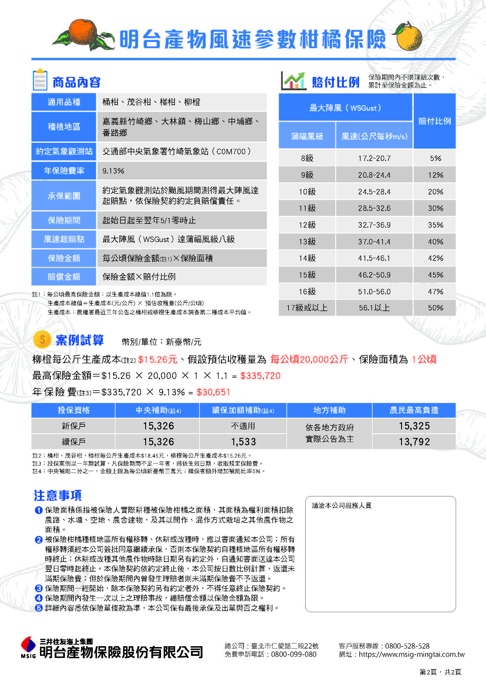 以投保1公頃椪柑為例,每公斤生產成本為18.45元,假設預估收穫量為2萬公斤,最高保險金額為40萬5,900元,年保險費為3萬7,059元,首次投保農民每公頃需負擔7,412元(續保者僅需負擔5,559元),若發生與去年丹娜絲颱風相同之最大瞬間風每秒36.3公尺,則賠付金額為14萬2,065元(保險金額40萬5,900元*賠付比例35%)。