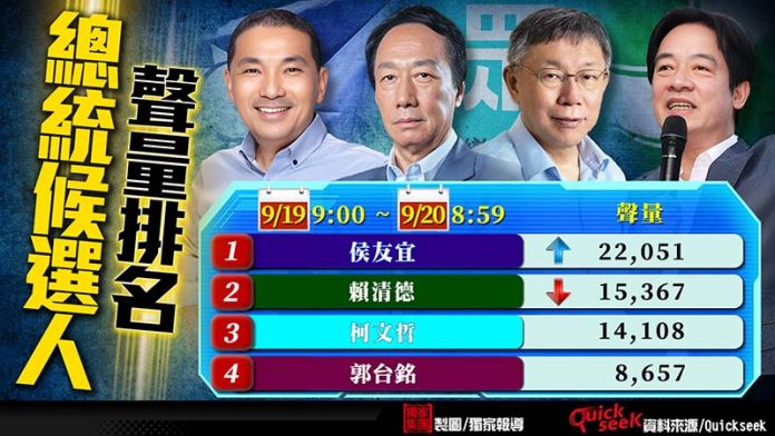 昨(19)日全網熱議的新聞是侯友宜支持度狂飆「超車柯文哲」,而郭董墊底,這讓正藍軍士氣大振,更引起網友熱烈討論,看來下一步就是泛藍整合,就能水到渠成了!。根據QuickseeK 總統大選每日情報總統候選人聲量排名,9/19到9/20的潛在候選人聲量排名侯友宜躍升第一名,聲量是22,051 (上升1),第二名是賴清德,聲量是15,367(下降1),第三名是柯文哲,聲量是14,108,第四名是郭台銘,聲量是8,657。