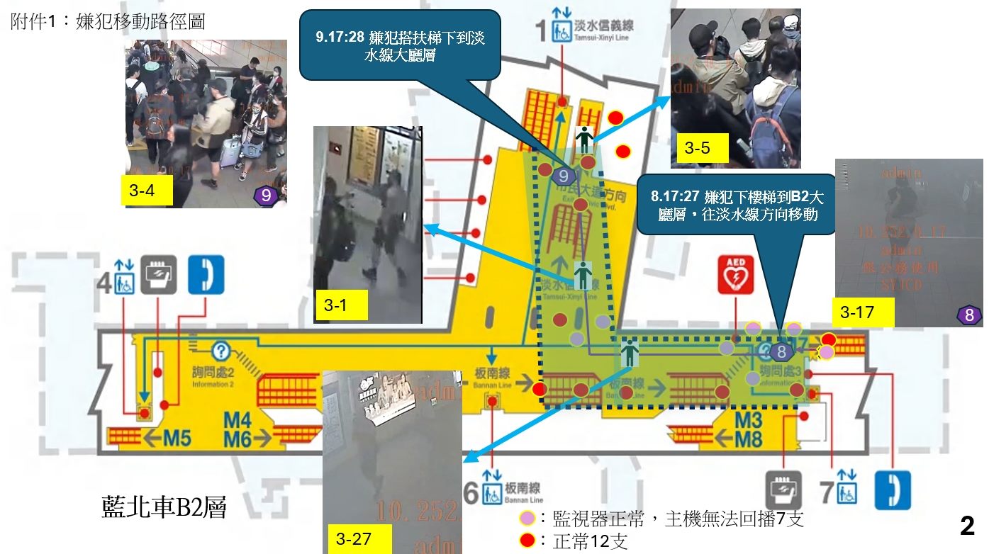 當天並無任何一臺監視器故障,然而在臺北車站B2層兇嫌路徑上其中一部錄影主機磁區於事發前一晚受損,可以看到即時影像但無法回溯。建置監視器畫面時,該站B2層區域設有四組NVR錄影主機,三組影像紀錄及回放功能皆正常運作,透過交叉比對追蹤兇嫌移動路徑,各樓層足跡全面涵蓋,沒有斷點,不影響辦案。