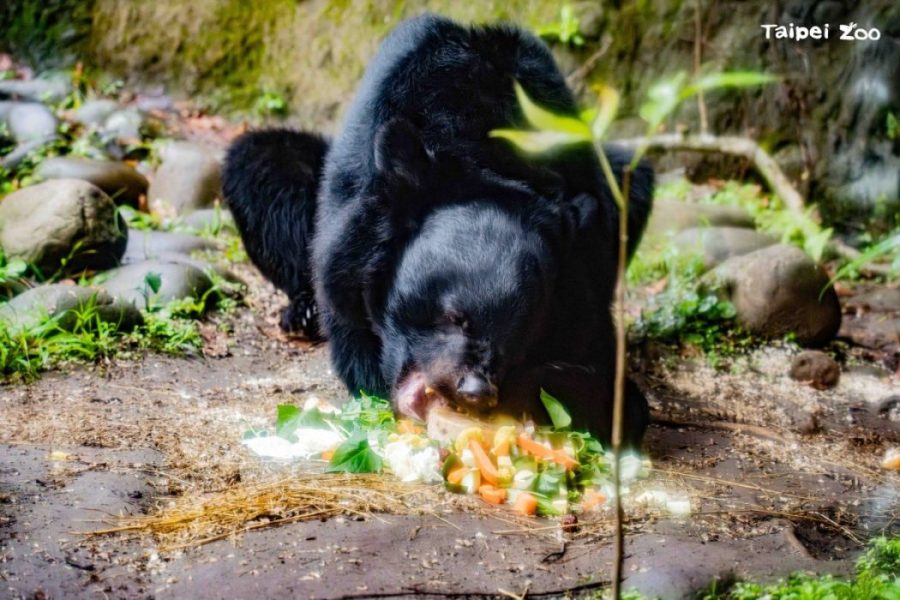 黑熊雖然身為食肉目動物,但食物中植物比例高達80%以上。牠們擁有極高的食性彈性,能因應季節尋找當令的果實、蜂蛹或小型哺乳動物。保育員製作「行為豐富化」食物,正是利用這種「什麼都想吃、什麼都想探索」的本能,增加黑熊在圈養環境下的活動量與刺激。今天保育員為黑熊「黑糖」精心準備的「蛋糕」內容包含燕麥、紅棗、葡萄乾混和蒸熟的主體,以空心菜、高麗菜、大黃瓜、紅蘿蔔,加上地瓜泥和堅果點綴,展現亞洲黑熊植食為主的菜單。