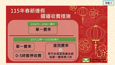 高公局提醒,為分散春節連續假期尖峰時段車流,於第一階段(除夕前):2月14日至16日實施單一費率;第二階段(初一後):2月17日至2月22日實施單一費率、國3「新竹系統至燕巢系統」單一費率再8折收費及全日0-5時暫停收費等措施(詳附圖3)。最後,高公局預祝大家春節連假快樂、行車平安。