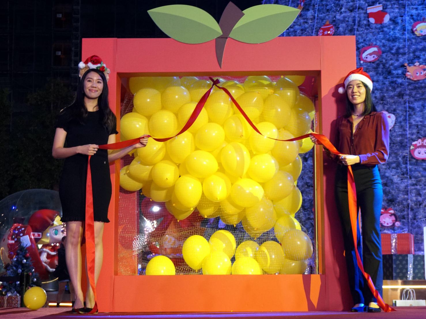 27日晚間6點,南紡購物中心於A2館1F南紡廣場舉辦「點亮南紡點亮愛 解開聖誕夜之光」活動,由瑞復大小聲鼓隊以感動人心的「傳愛開幕秀」揭開序幕。隨著點燈時刻到來,南紡購物中心董事長特助侯郁琳、臺南紡織股份有限公司董事侯郁瑢齊心拉開蘋果造型放飛氣球禮物盒的彩帶,250顆氣球瞬間飛向天際,正式點亮「蘋安綻Fun幸福相遇」主題展區。
