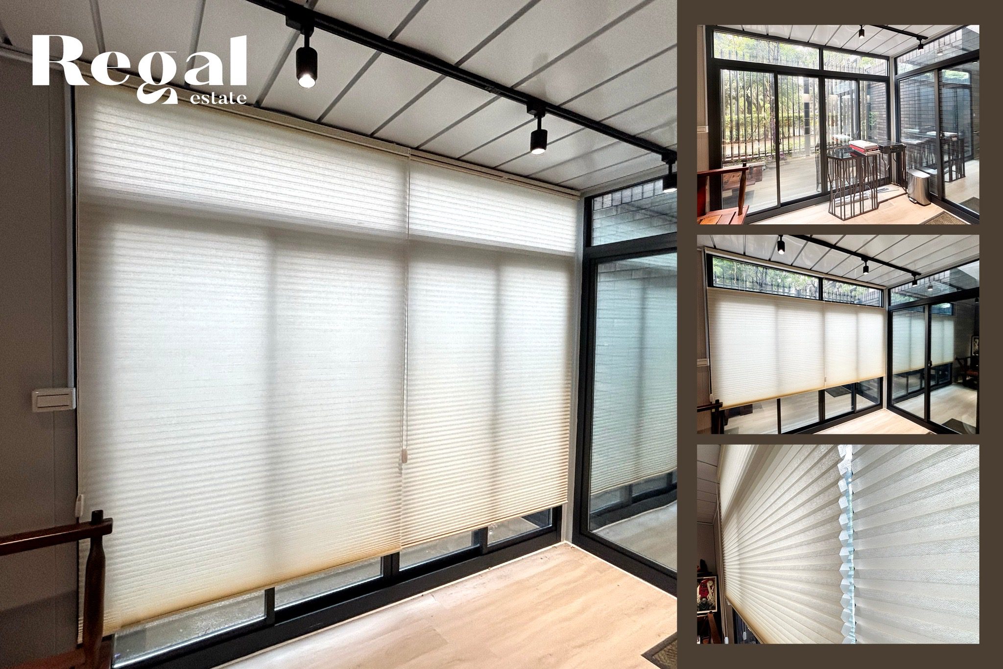 位於台北市的高端廚藝品牌「磐德廚藝」,創辦人本身熱愛藝術與茶文化,在院子裡以玻璃組合屋打造會客與品茗空間,並存放古董字畫及珍稀木質桌椅、茶具,受到強烈西曬的影響,家俱擺設有脆化、褪色等損壞的疑慮。因此採用了 芮格居家 Regal Estate 蜂巢簾 系統,以中空蜂巢結構有效阻擋紫外線與熱能傳導,藉此預防材質老化與褪色問題。蜂巢簾兼具遮光、美觀與節能效果,柔化光線之餘仍保留空間的通透感,讓整體環境維持穩定溫度與舒適光氛。此應用不僅展現專業防護與美學並行的設計理念,也成為現代高端空間維護居家質感的典範。
