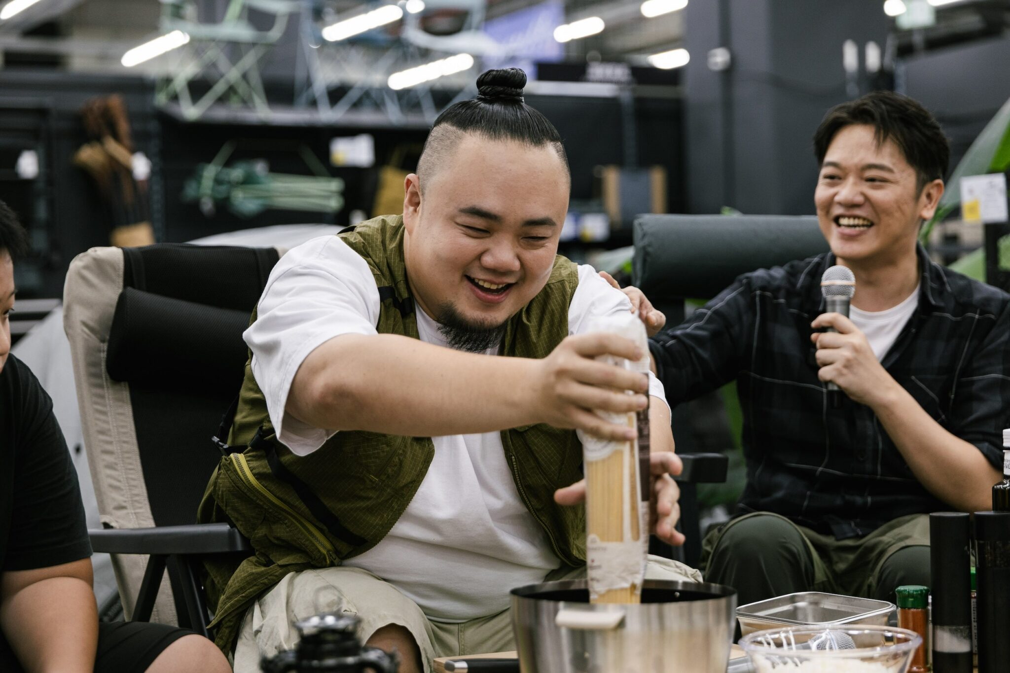 南屯門市活動當天索艾克身穿可調式登山長褲 與 輕量登山健行鞋,兼具快乾、耐磨、多口袋機能與街頭風外型,無論備料、搭帳、行走步道或拍照打卡,都能輕鬆展現舒適與時尚兼具的風格,笑著說:「做菜要帥,搭帳也要帥!」。大淵也以此造型登場,展現戶外潮流風範,時尚指數爆棚,現場他也推薦身上的 QUECHUA 卡其色男款背心 NH500,多口袋設計方便收納隨身物品,並具備防風、防潑水機能,能從容應對多變戶外天氣。材質透氣、吸濕排汗,長時間穿著依然舒適。