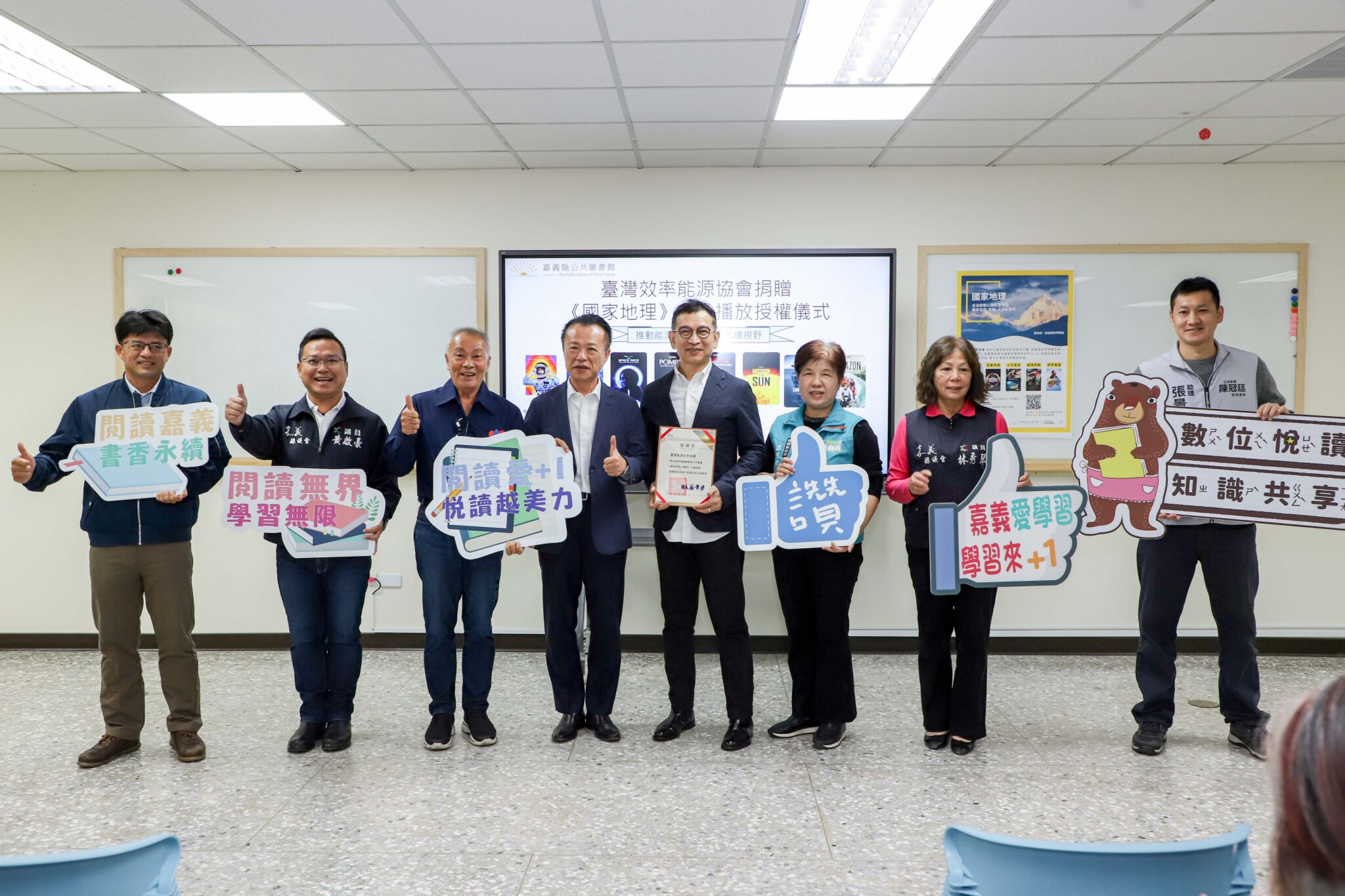 臺灣效率能源協會捐贈「國家地理」精選內容影片1年公共播放授權給嘉義縣公共圖書館,115年1月1日起民眾可在縣內合作圖書館內欣賞自然、生態與人文紀錄片,今18日舉行捐贈儀式,由嘉義縣長翁章梁代表受贈並回贈感謝狀。