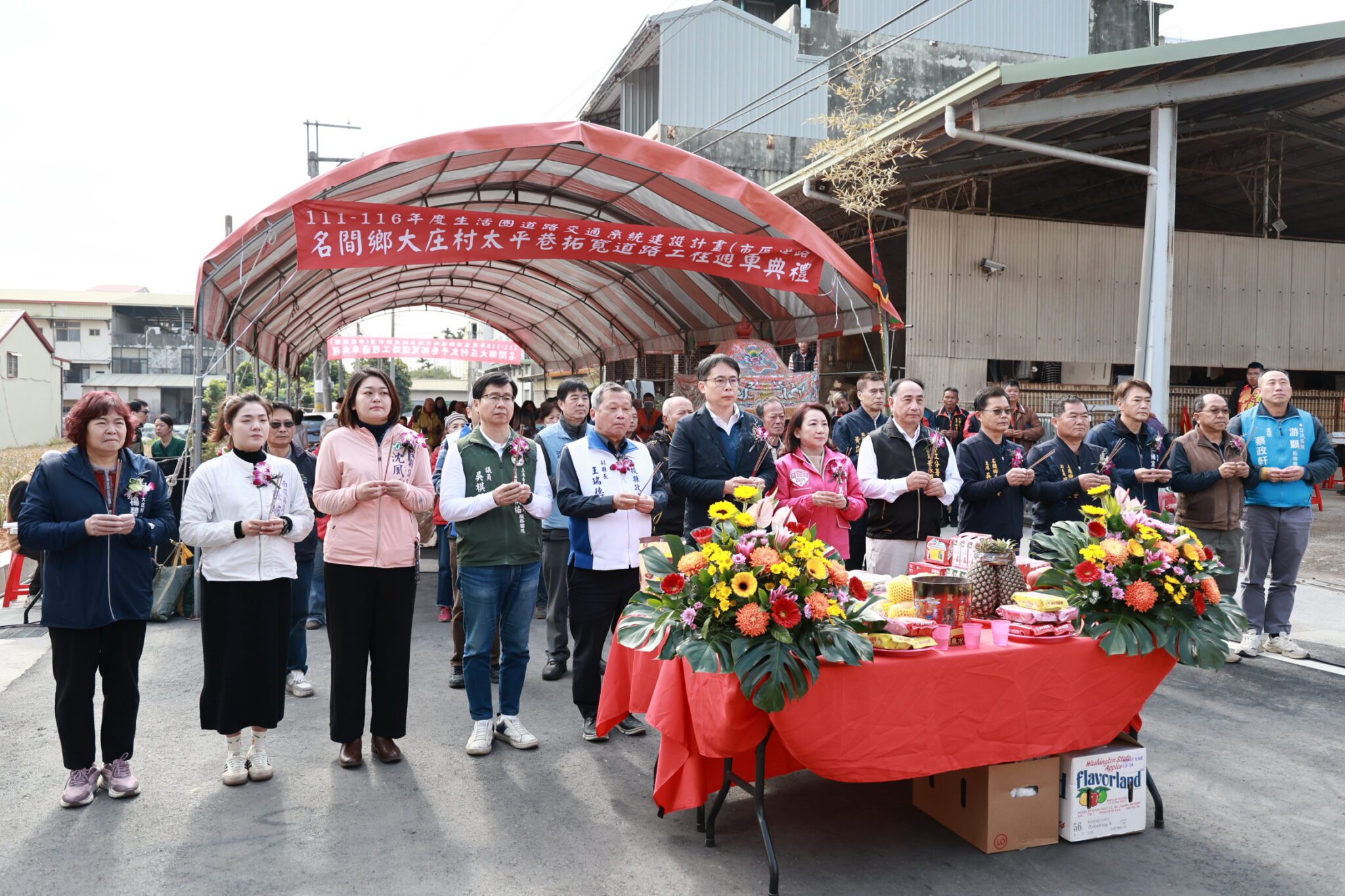 副縣長王瑞德、內政部國土管理署中區分署副分署長黃永興、立法委員羅美玲、縣議員吳棋楠、張婉慈、沈夙崢、名間鄉長陳翰立、鄉代會主席吳金樹及多位代表、村長及近百位鄉親都到場觀禮,除持香敬拜祈求平安外,也進行剪綵通車儀式,並在當地的大賢宮開漳聖王神駕及大鼓隊帶領下,走上全新完工的馬路上,實際體驗平坦寬敞的道路設施。