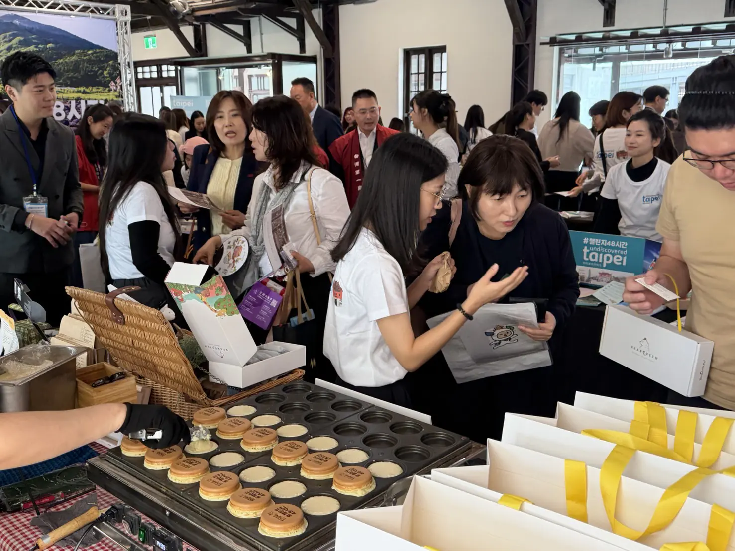 觀傳局進一步說,為讓臺北與韓國業者交流合作,本次觀光推介會有超過30家的臺北業者參加,涵蓋場館景點、溫泉資源、文創品牌與星級飯店等。活動由可愛的臺北城市吉祥物熊讚揭開序幕,現場除設置貓空茶席,並搭配赤峰街人氣現烤紅豆餅與大稻埕印花樂拓印體驗,將臺北街區生活與文化創意帶入會場,讓韓國業者在茶香、文化與街區特色中感受臺北的城市溫度,現場互動熱絡,韓方業者也在交流過程中表達:「這次在推介會現場品嚐到好吃的車輪餅、還有貓空現泡的茶,令人印象深刻,深度旅遊與體驗是新的旅遊趨勢,這樣的推介方式很棒!」、「這次來的臺北觀光業者很多元,有景點也有伴手禮等,對我們包裝產品很有幫助。」媒合成果豐碩。