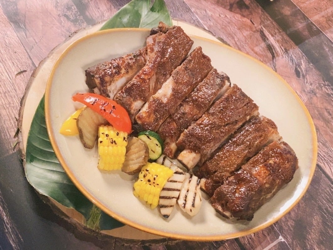 主餐更是整場重頭戲,「炸雞凱薩沙拉」酥脆炸雞搭配濃郁醬香,一入口就停不下來;「芥末椒鹽酥炸透抽」外酥內嫩,微辣刺激直接開胃;還有「義式香料紙包烤魚」與「BBQ美式豬肋排」,一個清爽一個豪邁,完美平衡整桌風味。
