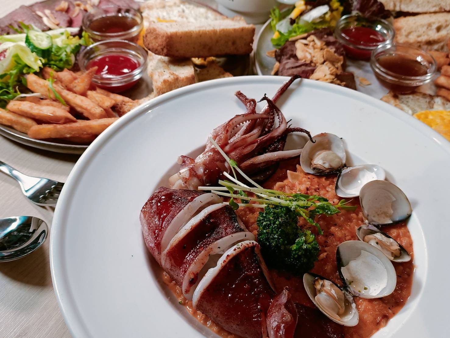 「蕃茄醬烤巨魷義大利麵亅以濃郁酸香的蕃茄紅醬為基底,酸中帶甜、層次分明。巨魷經烤焙後外層微焦、內裡柔嫩彈牙,搭配Q彈的義大利麵條,醬汁牢牢包覆每一口,鮮香濃郁、口感豐富。