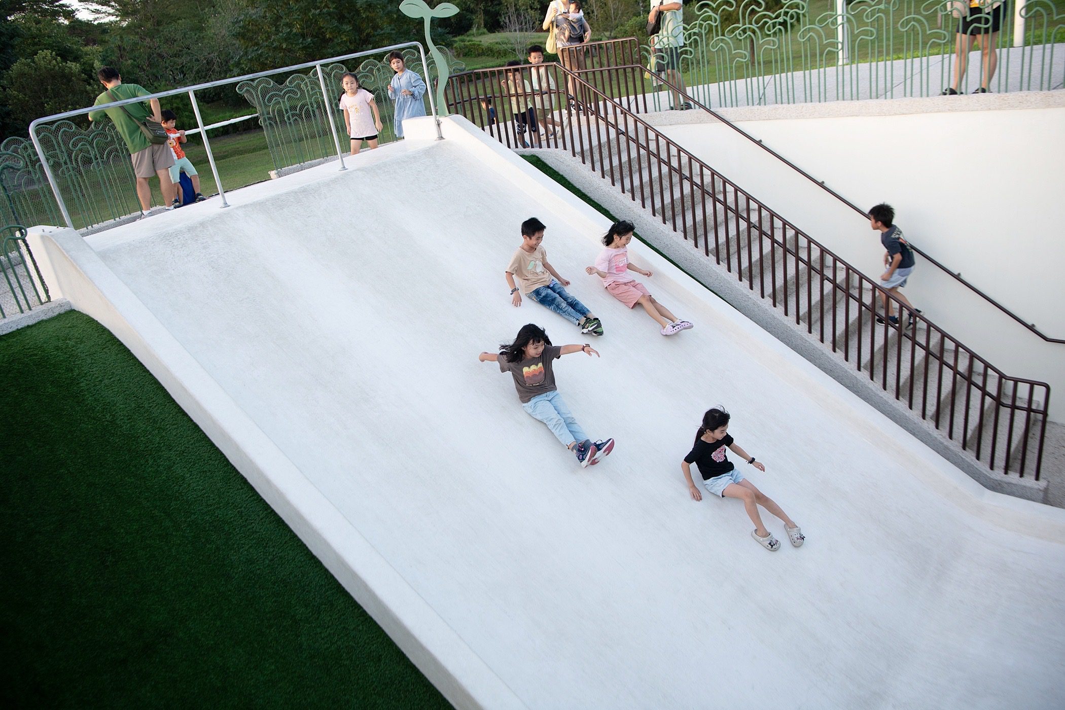 其次,需有家長的陪同與安全引導,遊戲前應向孩童說明不推擠、排隊輪流等基本規則,遊戲中則應全程陪同、即時關注孩童狀況,並在發現不當或危險行為時立即加以制止與糾正。此外,使用前應先檢查遊具是否有鬆動或破損等安全疑慮,並建議孩童穿著適合活動的服裝,避免穿戴拉繩、長帶或過鬆衣物,以免發生絆倒或卡住的危險;在混齡遊玩情況下,也應加強照顧年幼或行動不便的孩童,並與其他照顧者協調分工,共同營造安全、友善的遊戲環境。