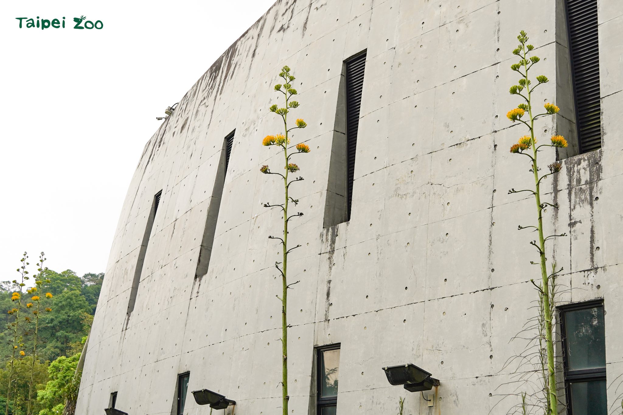 走到臺北市立動物園熱帶雨林室內館(穿山甲館 Pangolin Dome),除了近距離觀察棉頭絹猴、二趾樹獺、青鸞等蟲魚鳥獸,近期在館外周圍,有7株巨大的「龍舌蘭」(Agave)悄悄抽出了超過5公尺高挑的花莖,花朵正盛開。龍舌蘭最著名的特性便是「一生只開一次花」,在它們長達數十年的生命週期中,會不斷儲存養分,直到合適的時機,才會消耗全身的能量從葉叢內抽出一根巨大高直的花莖,在花莖旁則長出數株直徑約6至8公分的漏斗狀淡黃色成千上百的密集小花朵。