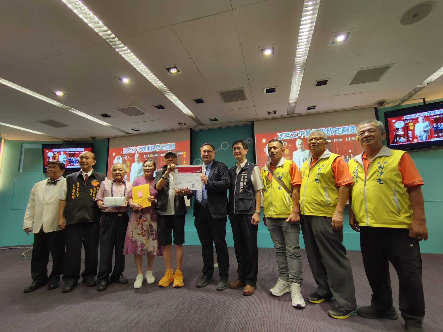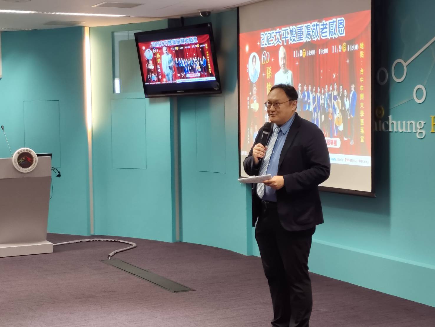 台中多媒體股份有限公司今(14)日舉行記者會,宣傳即將在11月8日及9日舉辦的《2025文平嫂重陽敬老感恩 孫情演唱會》,並聯合多家企業捐贈600張公益門票給社區及長青學苑長輩。台中市副市長鄭照新代表受贈表示,感謝企業照顧長輩,以實際行動回饋社會,預祝演唱會圓滿成功。