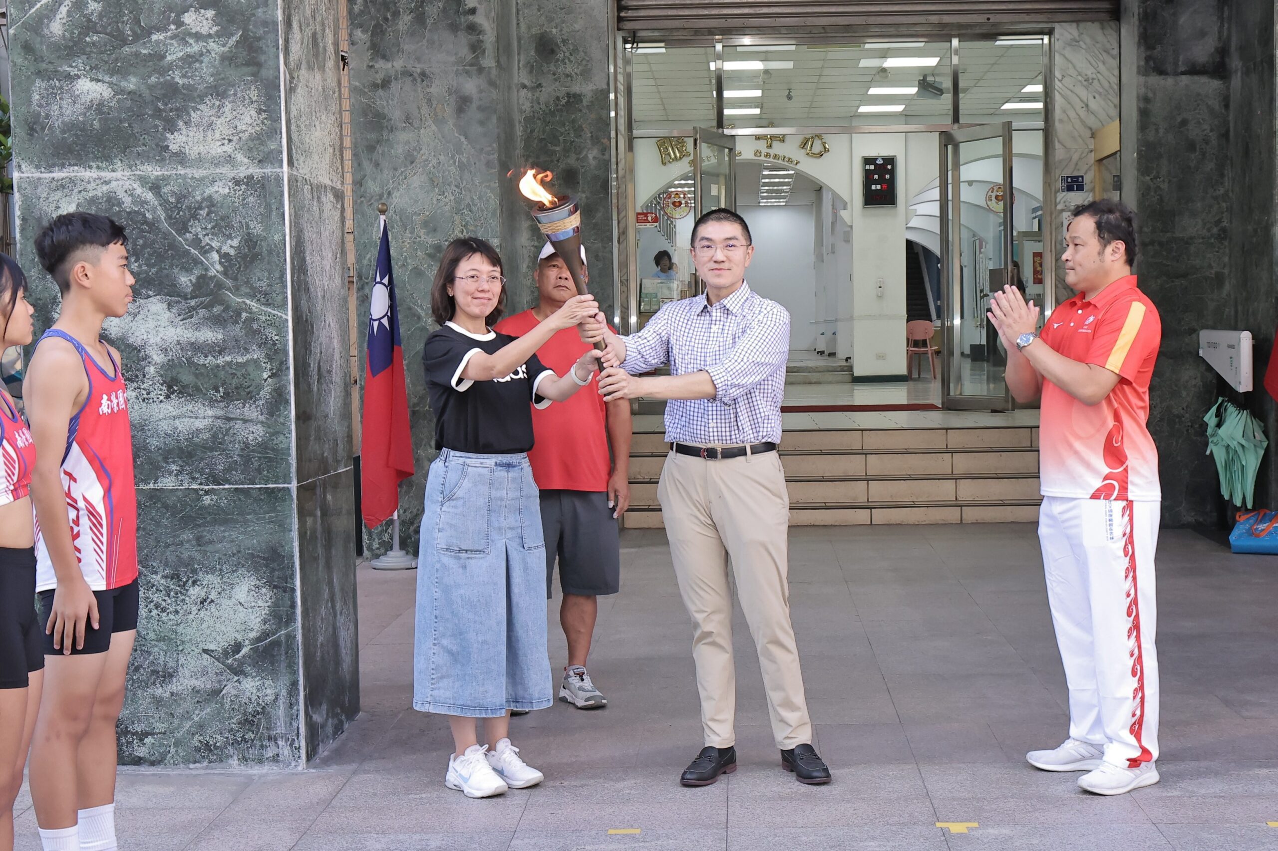 114年全國運動會聖火傳遞今(3)日下午抵達基隆市,基市府於市府一樓大門口廣場舉行迎接儀式,由市長謝國樑率領教育處副處長楊永芬等人共同迎接聖火。謝國樑表示,聖火象徵團結與榮耀,他期勉本市代表隊選手在賽場上全力以赴,為自己爭取榮耀,更為基隆締造佳績。