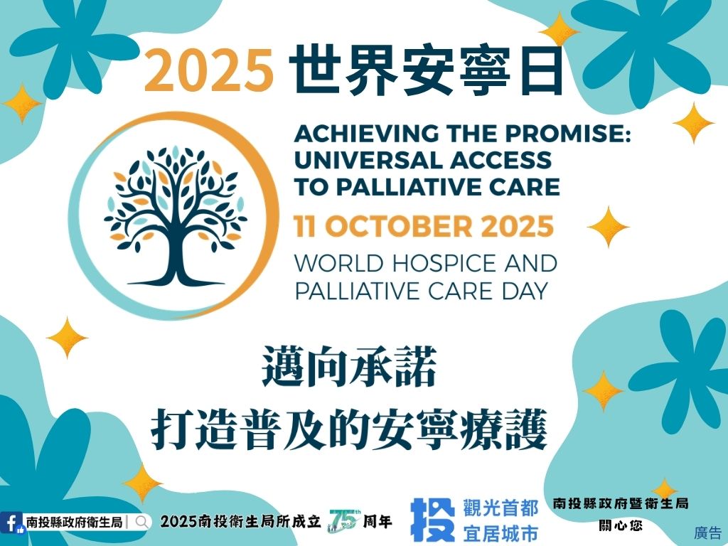 每年的十月第二個星期六為「世界安寧緩和醫療日」,今年主題為「邁向承諾:打造普及的安寧療護」,南投縣政府衛生局呼籲社會各界共同努力,讓安寧緩和醫療成為每個人都能享有的基本照護權利。