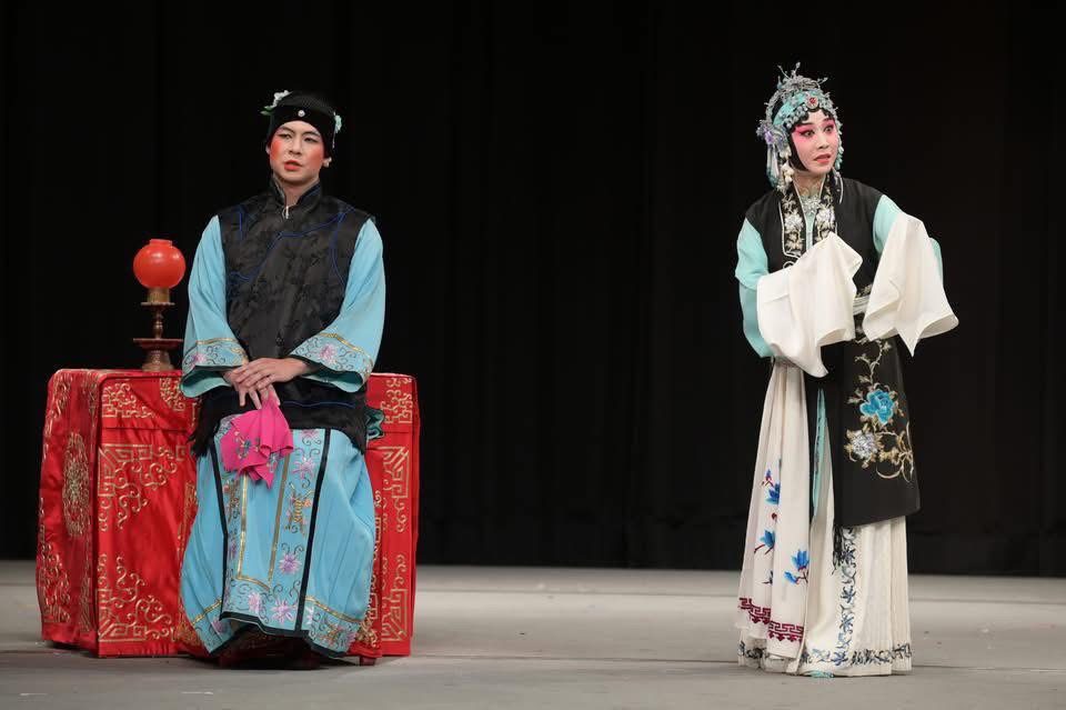 復興劇團優秀青年演員呂家男以青衣行當飾演春蘭(右)面對婆婆的苛責倍覺委屈。(新北市社會局提供)