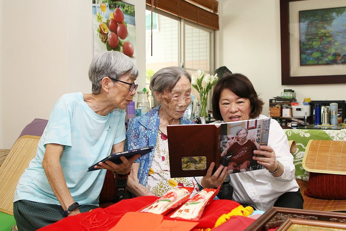 黃敏惠表示,很高興在重陽節前夕,來到百歲人瑞溫劉和瑗以及劉不碟的家中送上祝福,並感受兩位長輩走過一世紀的智慧,他們開朗而慈祥的笑容,就是最令人開心和溫暖的事。黃敏惠也提到,「體力、腦力、社會力」是長者生活不可或缺的三力,二位長輩在家人的照顧下,身體健康,頭腦清晰,不但可以讀報、清楚叫出子女的名字,劉不碟阿嬤每天都可至文化公園散步,感謝兩位長輩的家人以無微不至的照顧,讓他們笑口長開,常保身心的健康。他們溫馨和睦的家庭氛圍,更讓人感受到嘉義市「世世代代好徛起、大大小小攏佮意」的幸福,也感謝嘉義知名相片沖洗業者陸海鎮先生,為百歲人瑞與家族,記錄並製作精美溫馨的相簿,留下最美好的瞬間。