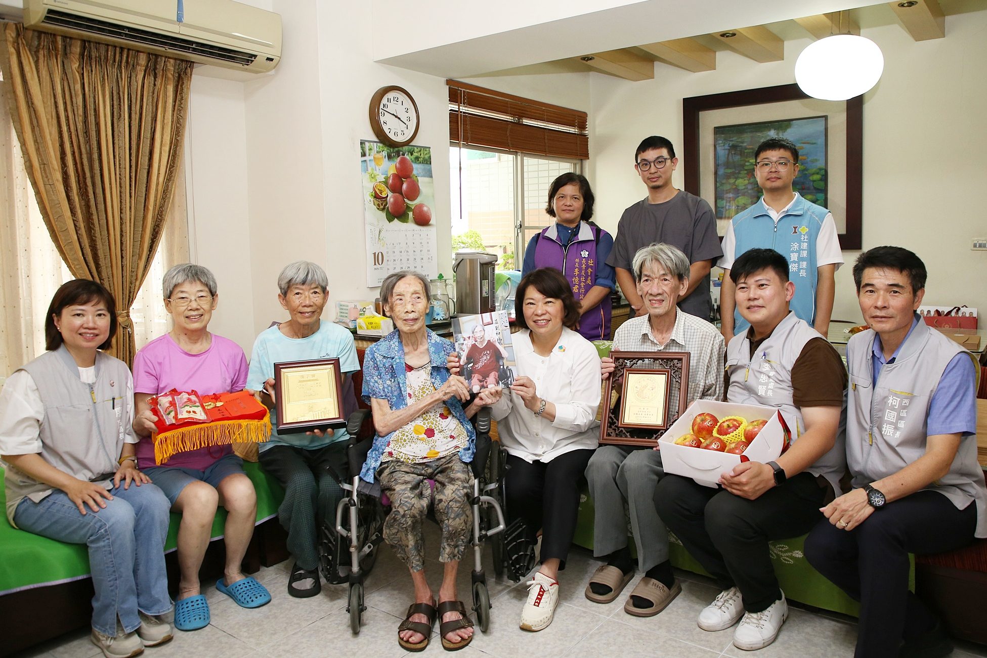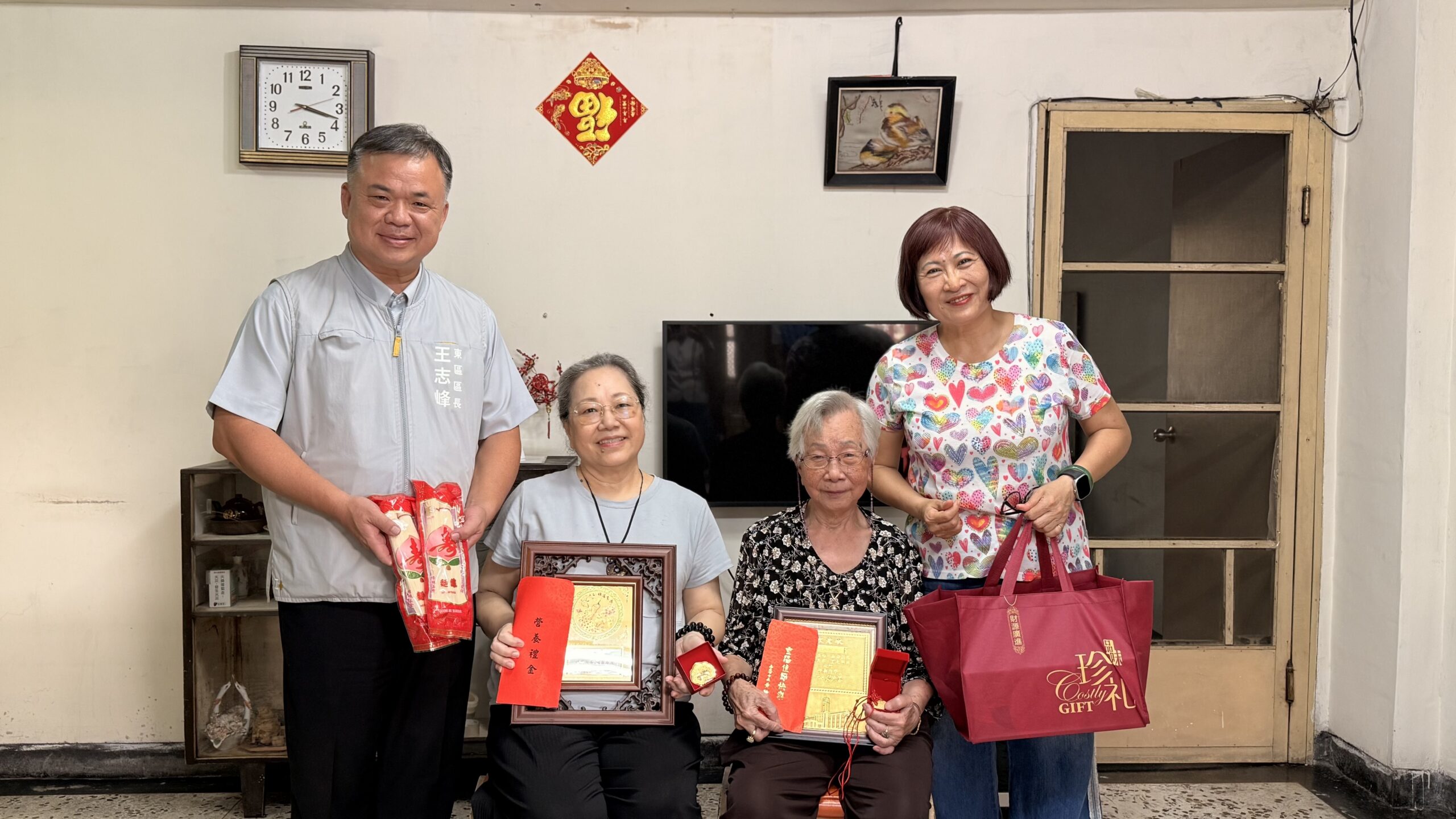 嘉義市長黃敏惠昨(16)日到溫劉和瑗奶奶、劉不碟阿嬤二位人瑞家中致贈重陽禮金及人瑞禮品(重陽節賀匾、金牌、賀壽壽麵、蘋果禮盒(代表平安)、營養禮金5,000元及重陽禮金1萬2,000元;另代贈衛福部金牌、總統府敬老狀(今年滿百歲人瑞)共八樣,代表八方富貴、吉祥平安。