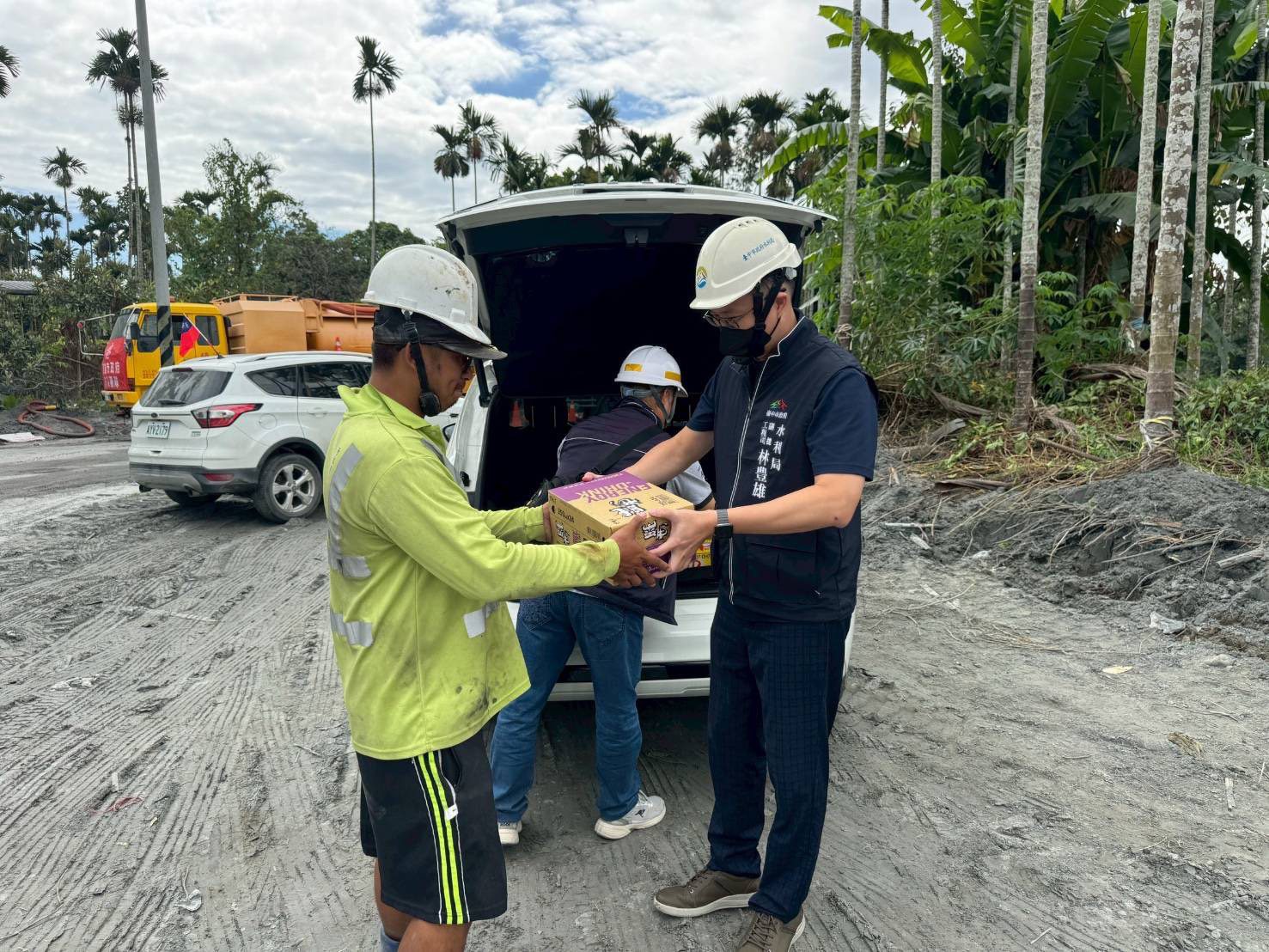 水利局長范世億表示,市府特別重視前線同仁的安全與身心狀況,感謝所有日以繼夜、不畏辛勞付出的超人夥伴,今(17)日上午特別請水利局副總工程司林豊雄代表前往災區送上點心、餅乾與瓶裝水等補給品,慰勞第一線救災人員,為奮戰中的隊員們補充體力、提振士氣,讓大家在艱困環境中感受到滿滿的支持與溫暖。