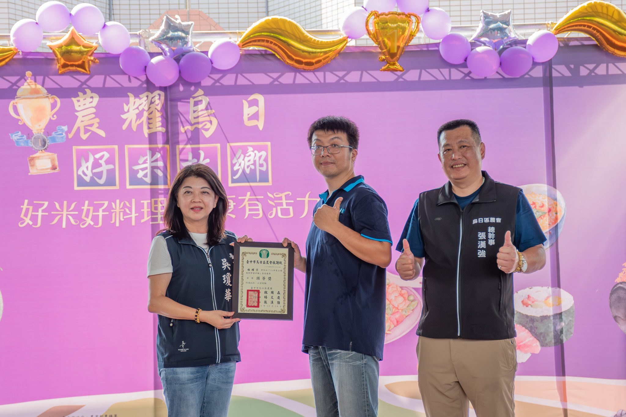 今日於活動中表揚台灣稻米達人選拔競賽、青農經營競賽、全國特色家政班競賽、四健競賽等獲獎單位,市府並感謝烏日區農會贊助台中市警政、消防單位工作辛勞,具體展現烏日區農會以實際行動深耕在地、實現公益,回饋社會的精神。