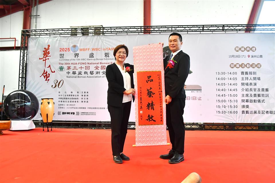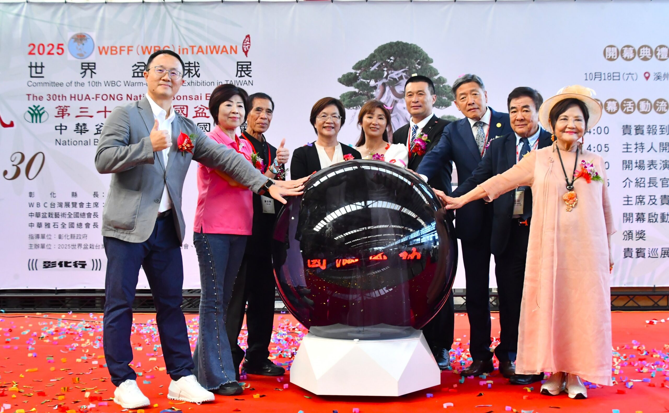 「2025世界盆栽展(WBC2025)暨第30回全國盆栽華風展」今(18)日下午於溪州公園舉行開幕典禮,即日起至10月26日展出收藏家與創作家的盆栽及珍貴雅石,縣長王惠美應邀與會,也於現場熱烈歡迎來自37個國家的貴賓齊聚彰化。希望藉由這次國際交流,讓彰化的盆栽設計與創意在世界舞台上綻放風貌,開啟更多合作契機。