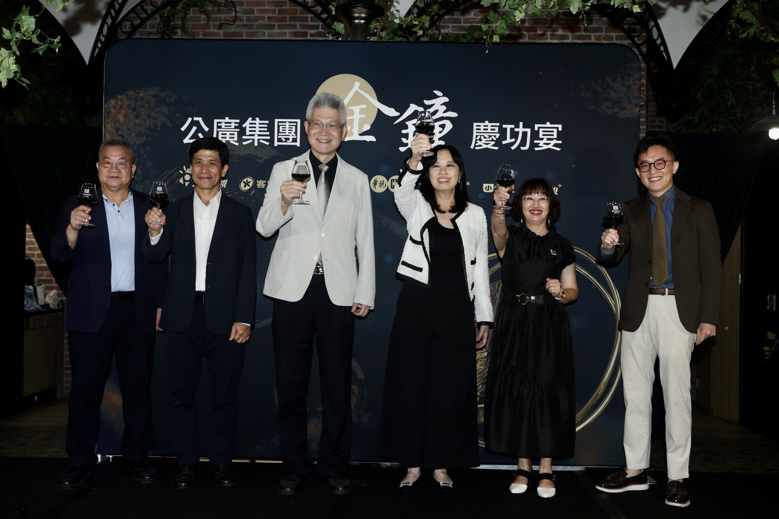 公視臺語台台長呂東熹(左起)華視總經理劉昌德、公廣集團董事長胡元輝、公視總經理徐秋華、公視副總經理謝玒玲、客家電視台台長向盛言共同舉杯慶祝。 照片提供:公視