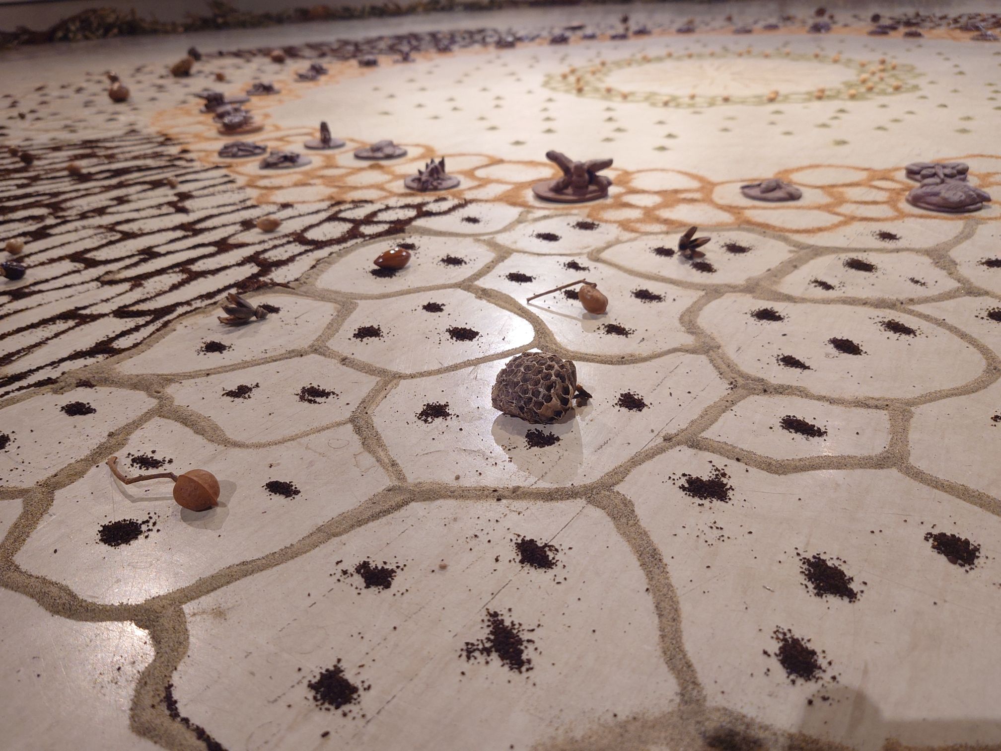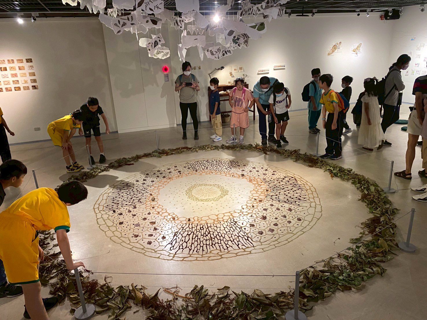 文化局表示,此展匯集了她的重要創作,包括榮獲台灣美術新貌獎的〈觀想〉,以植物粉塵凝視存在的無常;〈蜂作為橋樑的隱藏者〉,以纖維與蜂巢探討蜜蜂在農業與自然之間的重要角色。此外,此展更攜手太平學童創作以台中為主題意象的兩件新作:〈植拓山脈〉以回收紙漿與在地植物拼貼成山巒,象徵守護生態的祈願;〈物共生〉則以砂畫的手法,用細胞圖騰及孩子們以在地泥土捏塑的生物,隱喻土地與生命的共生。