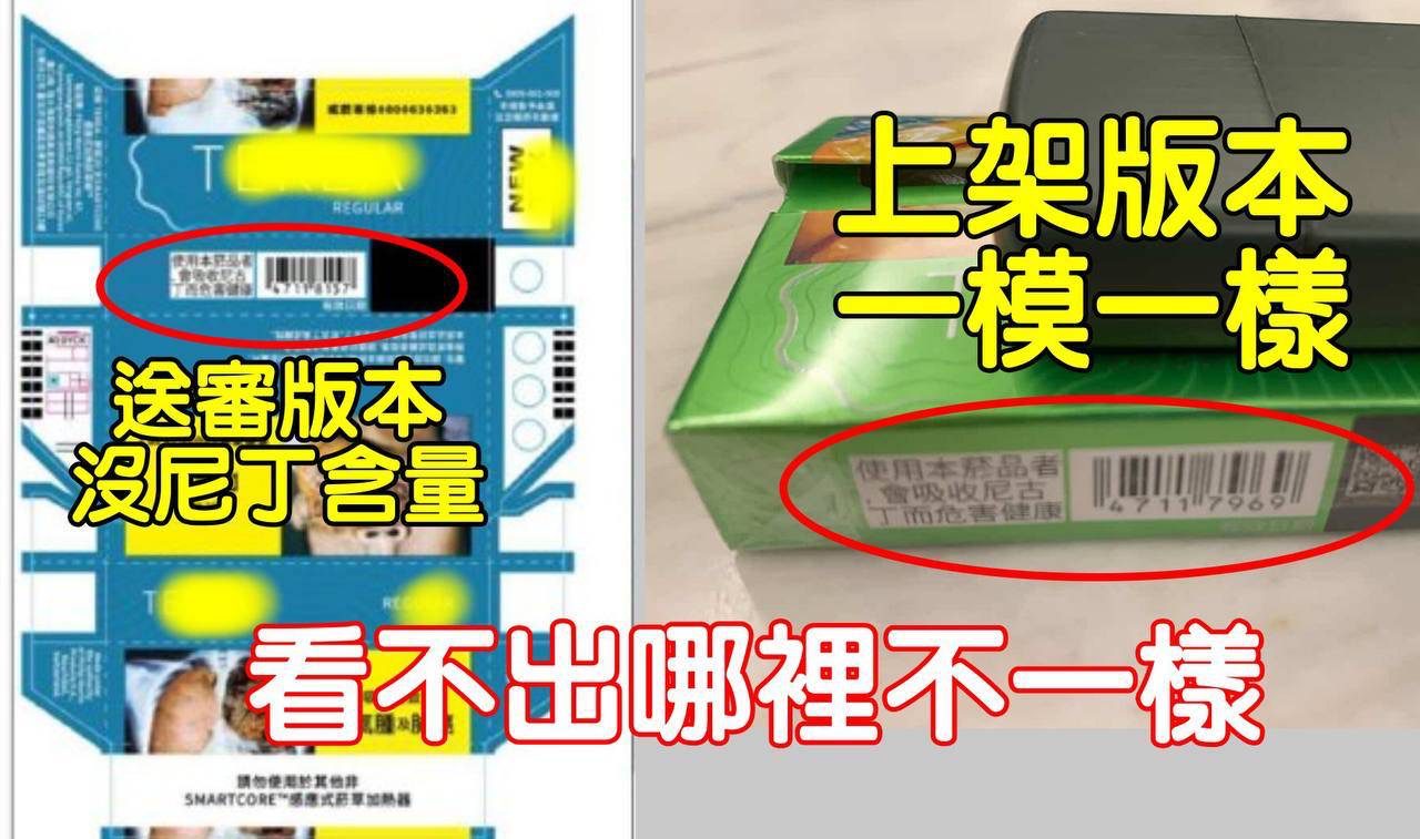 節目中也出示一組網路流出的資料圖,顯示業者送審版與實際上市版包裝一致。圖中可見送審樣本上本就未標示尼古丁含量,與實際上架包裝相同;主持人樊啟明並在現場拿出一包下架前購得的加熱菸,肉眼比對後確認包裝內容與送審圖一致,難以理解衛福部何以認定不符審核文件。