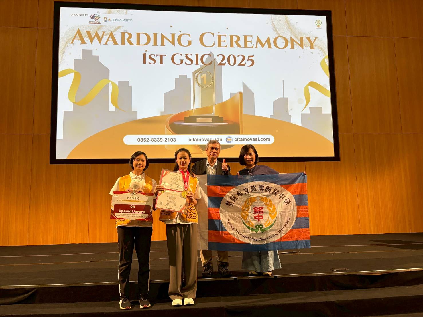 基隆市立銘傳國中學生在2025年IEYI(International Exhibition for Young Inventors,國際青少年發明展)表現亮眼,以作品〈伸縮式延長插座〉勇奪金牌,並代表台灣赴印尼雅加達參加「全球永續創新發明競賽(GSIC)」,10月18日與國際好手同場競賽,10月20日公布成績且頒獎,銘傳國中同學代表台灣,再度奪下金牌與特別獎,為國爭光。