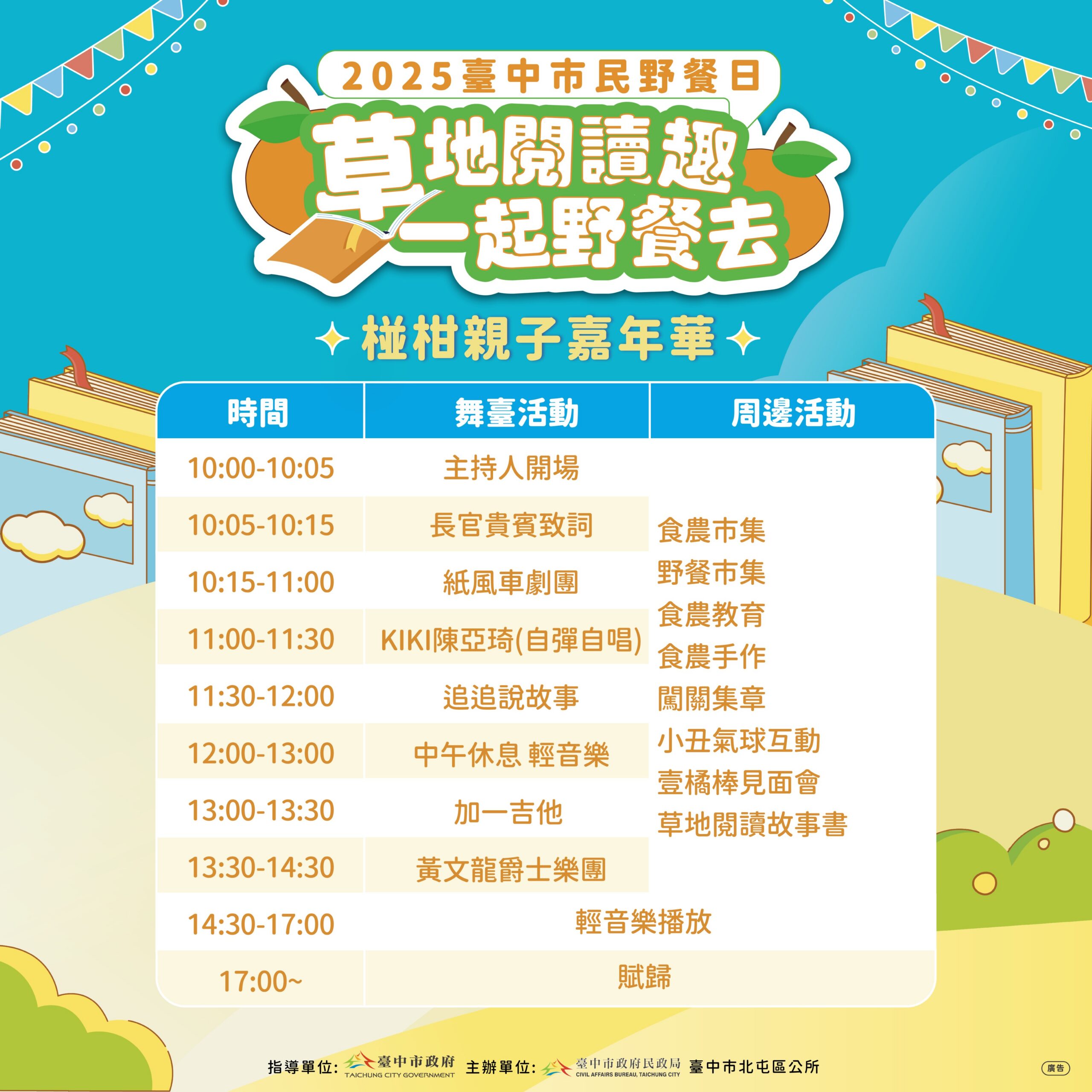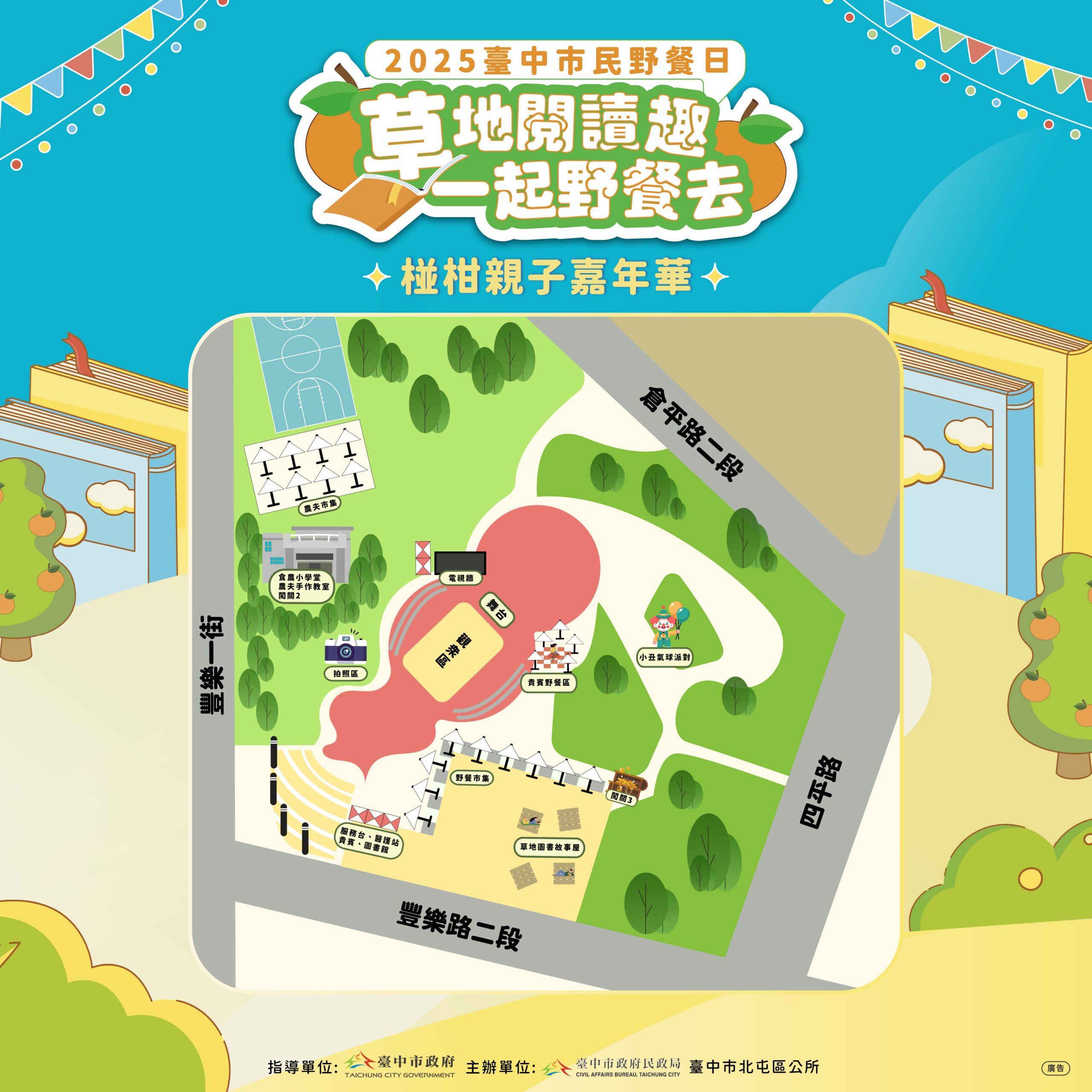 陳區長指出,除精采表演外,現場並打造「秋日打卡美景區」,以繽紛花卉、當季大坑柑橘元素及書香造景,營造夢幻野餐氛圍,愛拍照的民眾千萬別錯過;另「草地閱讀區」則提供多樣互動遊戲與閱讀體驗,最適合親子家庭共度愉快時光。此外,11月正值大坑椪柑產季,活動也設有「食農小學堂」及食農市集,除宣導「吃在地、食當季」理念,並推廣北屯區優質椪柑品牌形象。