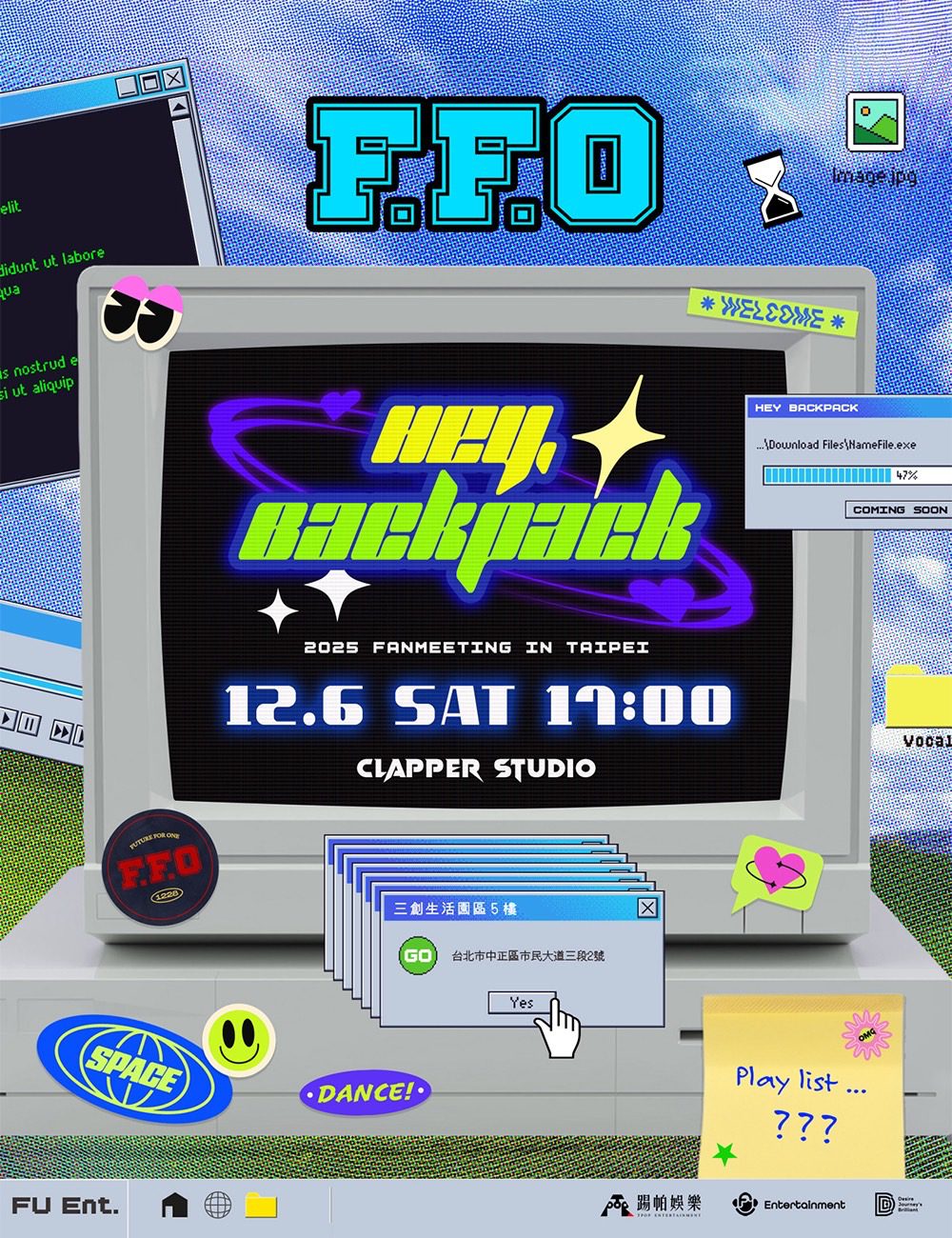而關於Backpack敲碗已久的新歌,F.F.O將帶著新歌再見面會上首唱,希望和一路一起成長、探索未知的Backpack們,一起感受到青春又青澀的時光,主唱俊希更透露,新歌對「唱功」的要求,比起過往的歌曲將更上一層樓,希望到時候大家都會喜歡。「2025 F.F.O Hey, Backpack Fanmeeting in Taipei」12月6日17點於CLAPPER STUDIO舉辦,門票開賣時間為11月17日18點,購票請洽拓元售票。