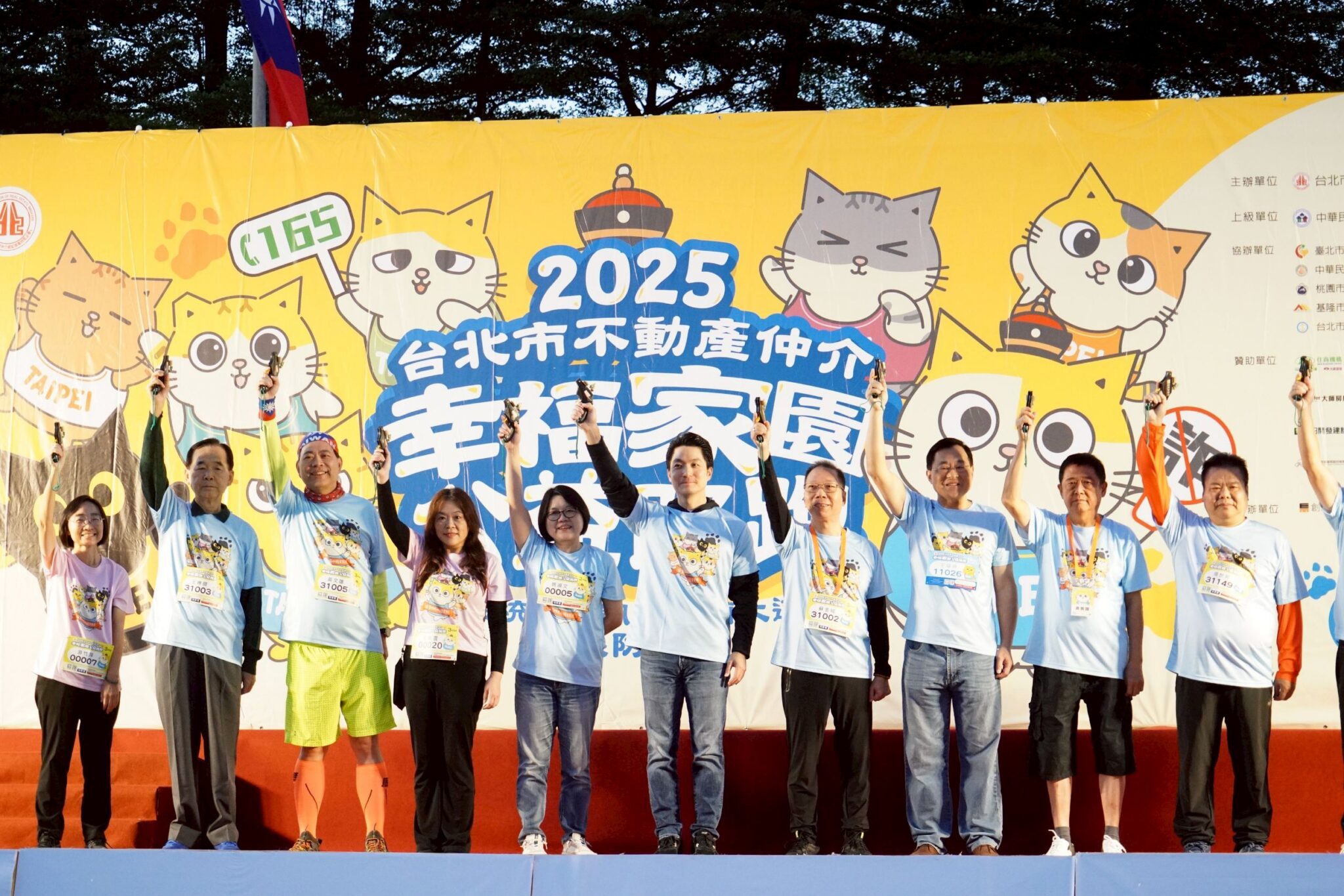 臺北市長蔣萬安今(23)日一早出席「2025台北市不動產仲介幸福家園公益路跑」,與眾多參與者在總統府前一起為公益開跑。