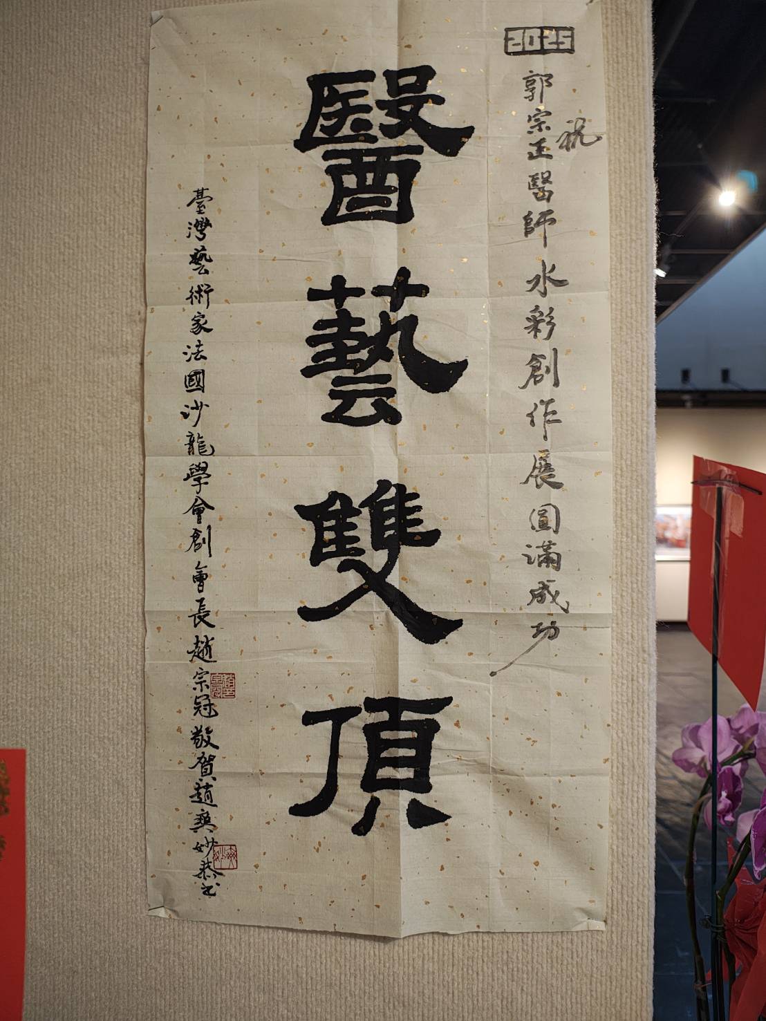 白天手拿診器,到了夜晚拿起畫筆作畫,過程中轉換的平順自如,先後曾以三峽祖師廟等多幅畫作,入選法國藝術家沙龍多次,榮登巴黎藝術殿堂展出,台灣藝術家、法國沙龍學會創會長趙宗冠盛讚郭宗正醫藝双頂,並以墨寶祝賀畫展成功。