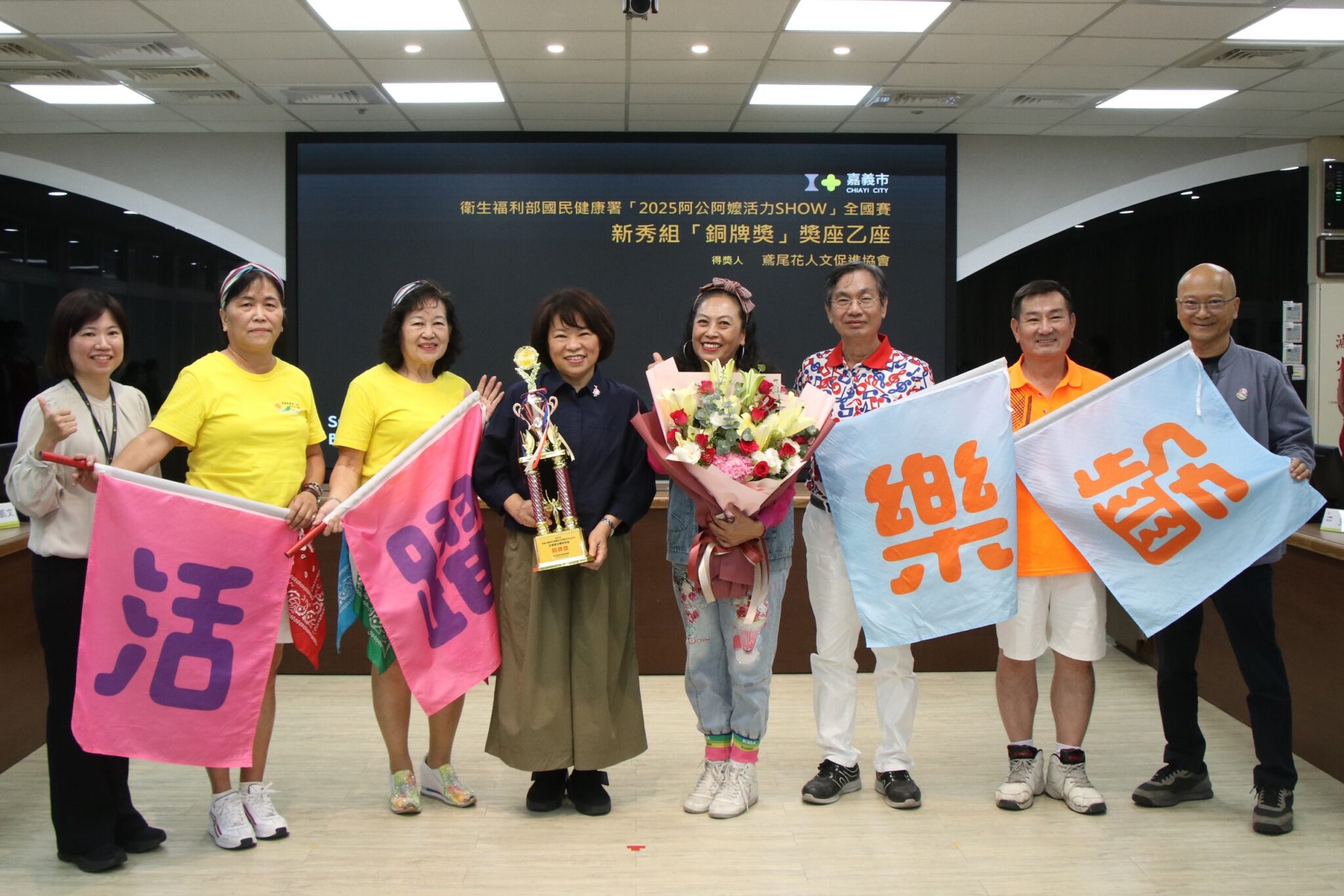 國民健康署於10月15日在新北市板樹體育館舉辦「長者活躍老化競賽」全國總決賽,匯集各分區金銀隊伍同場競技。嘉義市由育英里辦公處「育英火雞隊」及鳶尾花人文促進協會兩支代表隊出賽,雙雙奪下常勝組及新秀組銅獎佳績。11月26日,獲得佳績的兩隊於市府市務會議時將獲獎榮耀與市府團隊分享,黃敏惠市長大讚參賽成員洋溢熱情,展現滿滿活力,現場氣氛溫馨。