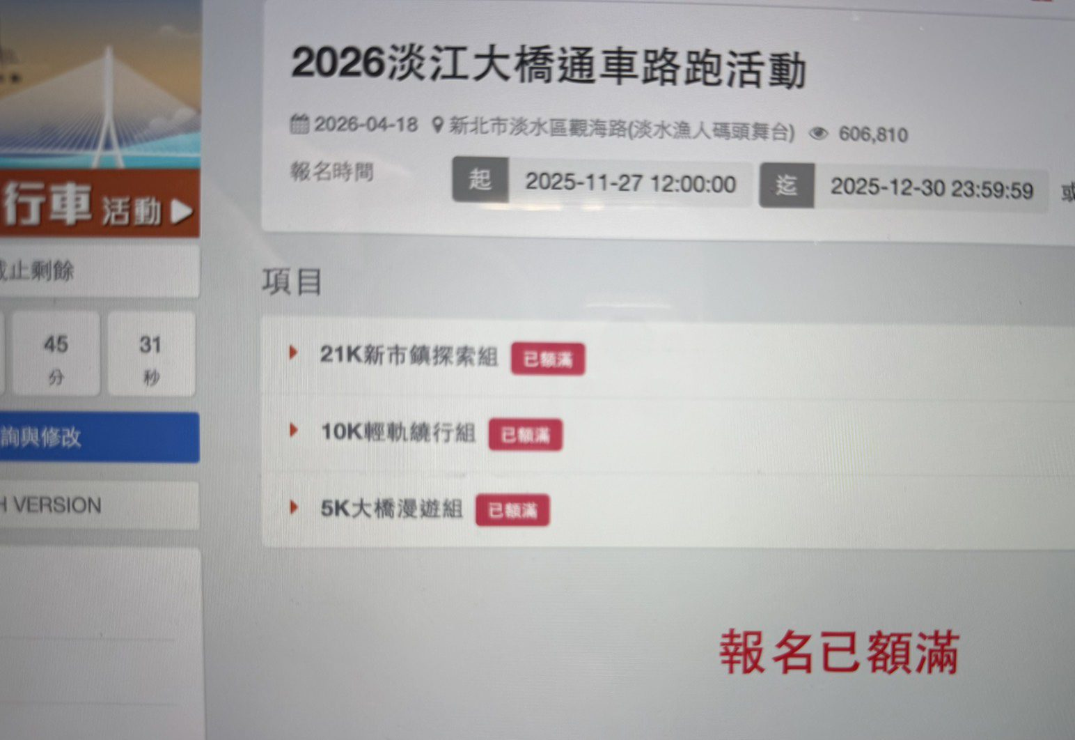 交通部公路局預計明年4月舉辦淡江大橋路跑活動,昨(27)日中午12時開放報名,5分鐘就額滿,惹來許多跑者抱怨名額太少,引發議論,地方人士更批未接獲通知,也不知有此活動,中央決定活動時間也未跟地方討論。新北市-長侯友宜今天被問及此事時表示,一項活動要辦,中央也好、地方也要辦,大家要合作。不要中央想要辦什麼,也沒有經過地方討論,自己想要做什麼就做什麼,這樣不好。希望中央要聽進去,任何的活動都是一起要配合,更重要的不能說你獨佔把好的時間佔走了,然後剩下來分配也不協調就丟給地方,地方怎麼辦活動,那你這樣子不是太「拗蠻」了嗎?