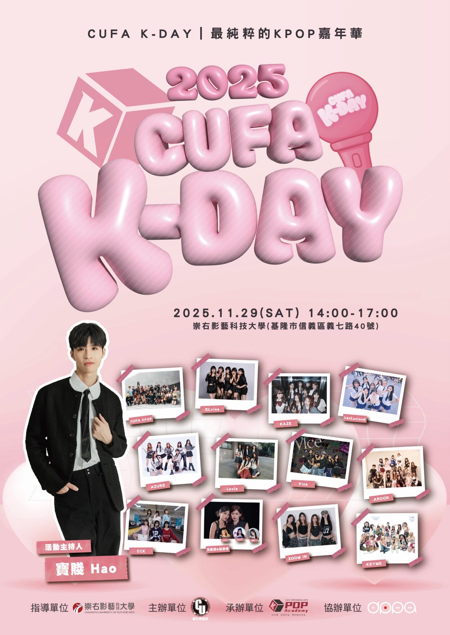 2025 年 11 月 29 日,由崇右影藝科技大學表演藝術系主辦的 《CUFA K-DAY 嘉年華》 在金鳶劇場盛大登場。本活動以「最純粹的 KPOP 體驗」為核心,結合舞台演出、百人隨機舞蹈、市集、餐車、專業攝影棚體驗與韓流互動遊戲,打造一場專為年輕世代設計的全方位韓流文化盛會。