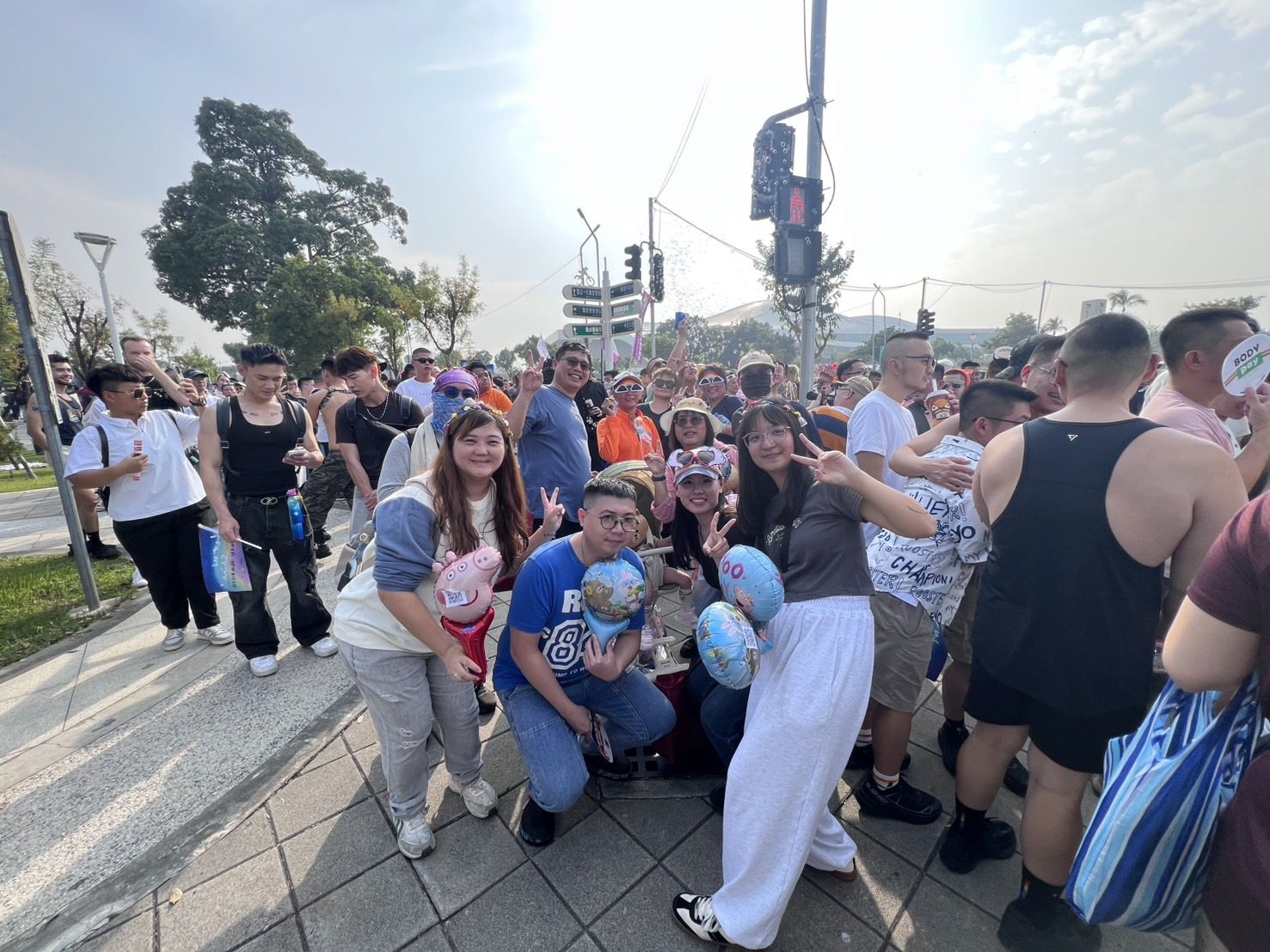 但當他們戴起彩虹眼鏡、提著氣球、與隊伍中的布偶熊合照,當沿路的民眾喊著加油、頻頻向他們比出「Love is Love」的手勢,他們的步伐開始鬆開,臉上的表情也變得明亮。