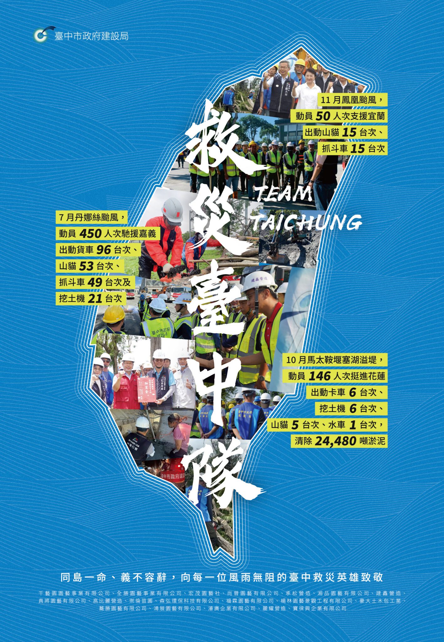 陳局長表示,花蓮光復鄉於114年9月23日受樺加沙颱風重創,豪雨引發馬太鞍溪堰塞湖壩頂溢流,造成嚴重災情;隨後在11月12日,宜蘭蘇澳又因鳳凰颱風外圍環流降下特大豪雨,多處地區嚴重淹水,災況同樣嚴峻。盧市長獲報後立即指示成立「救災台中隊」,並協調麗耀營造、建鑫營造、豪大土木包工業、宏茂園藝社、濬廣企業、高比麗營造、金瑞營造、揚林園藝景觀工程、真將園藝、森弘環保科技、寶徠興企業、千藝園園藝事業等廠商,全力投入兩地災後復原,實踐「同島一命、守望相助」的價值。