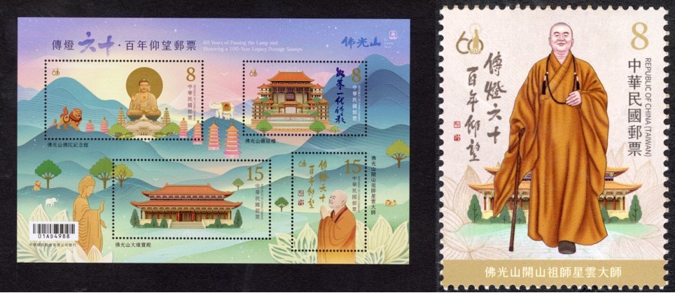 三、傳燈六十.百年仰望郵票:特種郵票,預定115年3月3日發行。民國 115年(西元2026年)適逢佛光山開山六十年暨星雲大師百歲誕辰,為表崇敬與緬懷,發行郵票1枚及小全張1張,郵票面值為8元,小全張內含面值8元及15元郵票各2枚。
