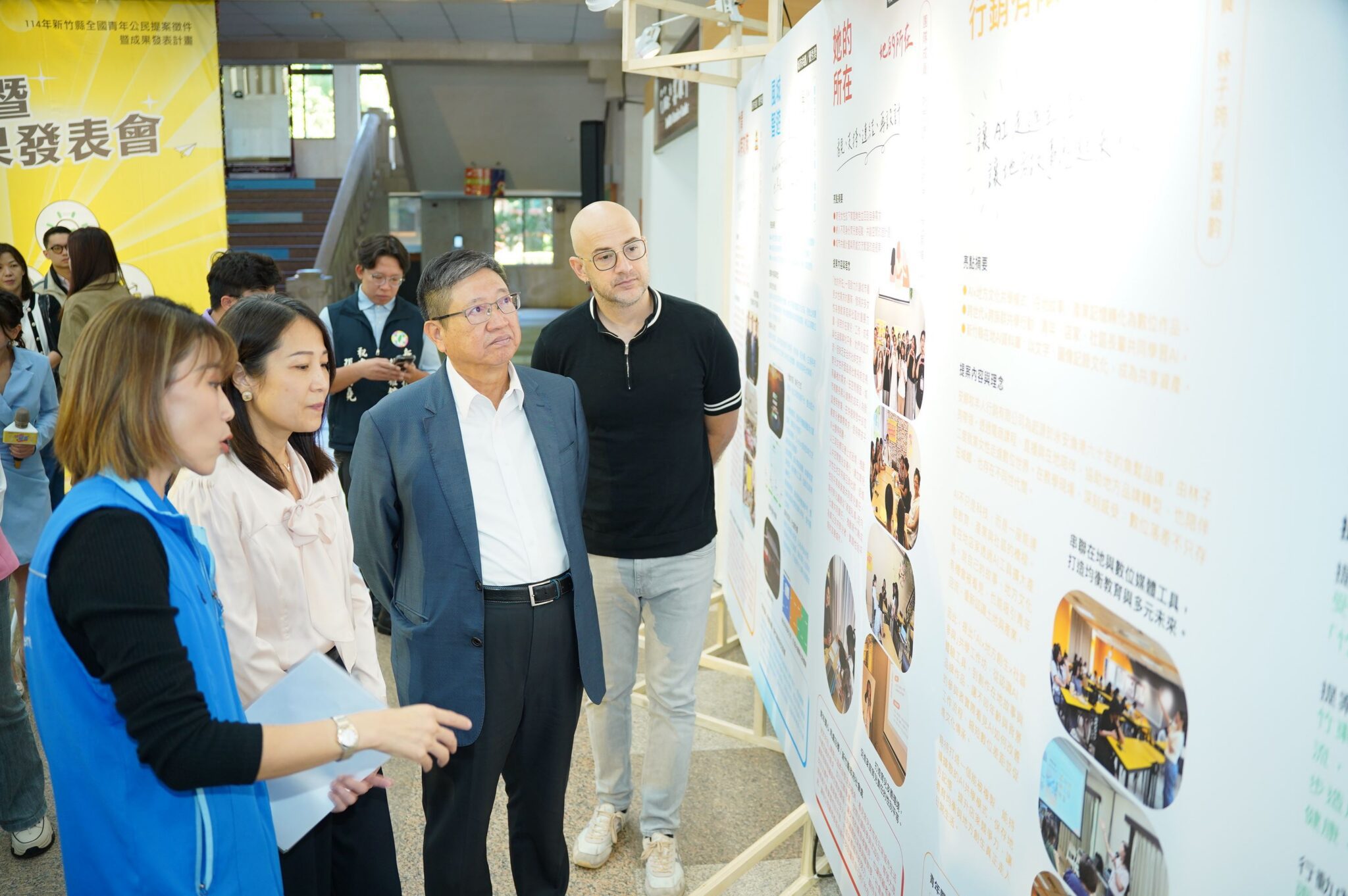 新竹縣政府教育局今(11)日於縣府一樓大廳舉辦「114年全國青年公民提案競賽-竹光寶盒|城市共創靈感庫」頒獎暨成果發表會,邀請獲獎團隊以展覽及提案內容簡報呈現青年如何以創意行動回應在地公共議題及推動社會創新。本次活動不僅是頒獎典禮,更是一場青年世代成果展與交流平台,展現青年無限的創意與公共參與的熱情。