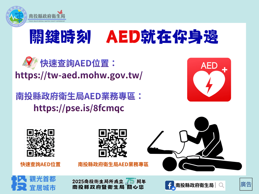 衛生局也積極推動「AED安心場所」認證,每兩年需認證一次。除鼓勵公共場所設置AED外,亦規範該場所70%以上員工通過心肺復甦術及AED使用訓練。民眾亦可透過公共場所AED急救資訊網查詢認證地點,安心旅遊、放心使用。未來將持續推動縣內公共場所AED設置、安心場所認證及相關急救教育訓練,讓民眾能有臨危不亂意識及緊急救援能力,以提高患者的生存機率,使更多生命在關鍵時刻獲得及時守護。公共場所AED設置地點及教學影片,可至AED急救資訊網查詢:https://tw-aed.mohw.gov.tw/。縣府衛生局AED業務專區:https://pse.is/8fcmqc。