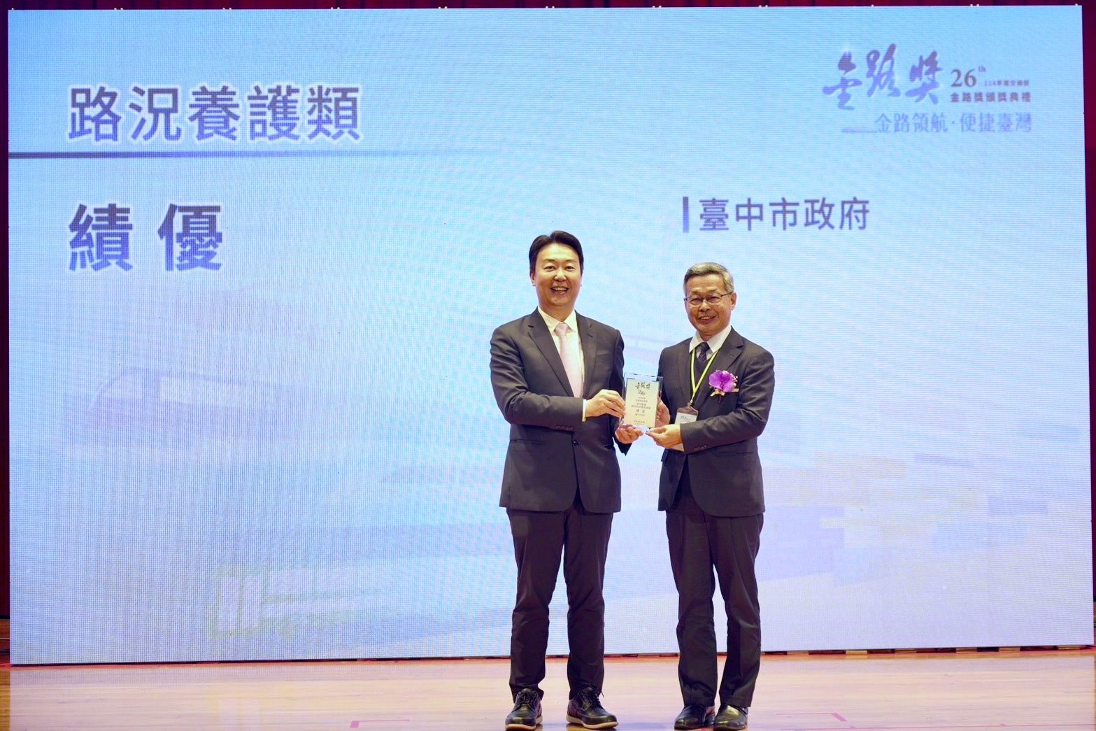 交通部日前公布素有交通界奧斯卡獎美名的114年度「金路獎」得獎名單,台中市於「橋梁維護作業」項目中脫穎而出,榮獲六都「第一名」殊榮,不僅展現橋梁養護專業實力,並創下連續6年獲得「績優」肯定的亮眼紀錄;今(12)日台中市由建設局長陳大田代表盧秀燕市長出席受獎,市府建設團隊長期系統性推動橋梁巡檢、預防性維護與結構安全強化工程,確保全市2,315座橋梁通行安全無虞,此次再度獲獎,凸顯台中市在交通建設與公共安全維護上的卓越成果。