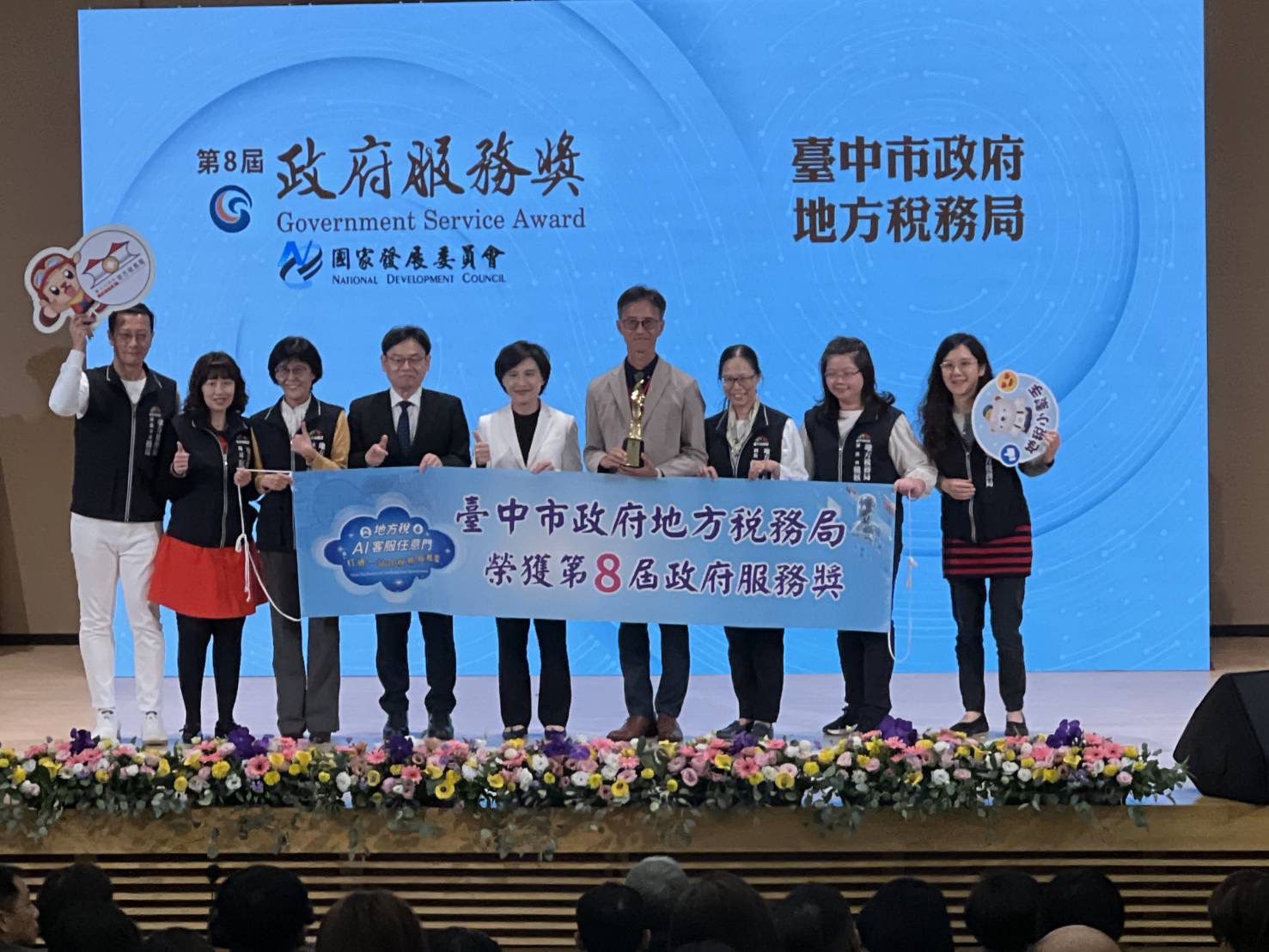 國家發展委員會今(15)日在國立政治大學公共行政及企業管理教育中心國際會議廳辦理第8屆「政府服務獎」頒獎典禮,由行政院副院長鄭麗君親自頒獎表揚。中市政府地方稅務局繼108年榮獲第2屆政府服務獎後,再次以智慧創新服務成果脫穎而出,憑藉「地方稅AI客服任意門—打通一站式稅務服務雲」方案,從144個參賽機關中脫穎而出,榮獲「第8屆政府服務獎—數位創新加值」獎項,充分展現落實市長盧秀燕推動智慧城市與數位治理的施政成果。