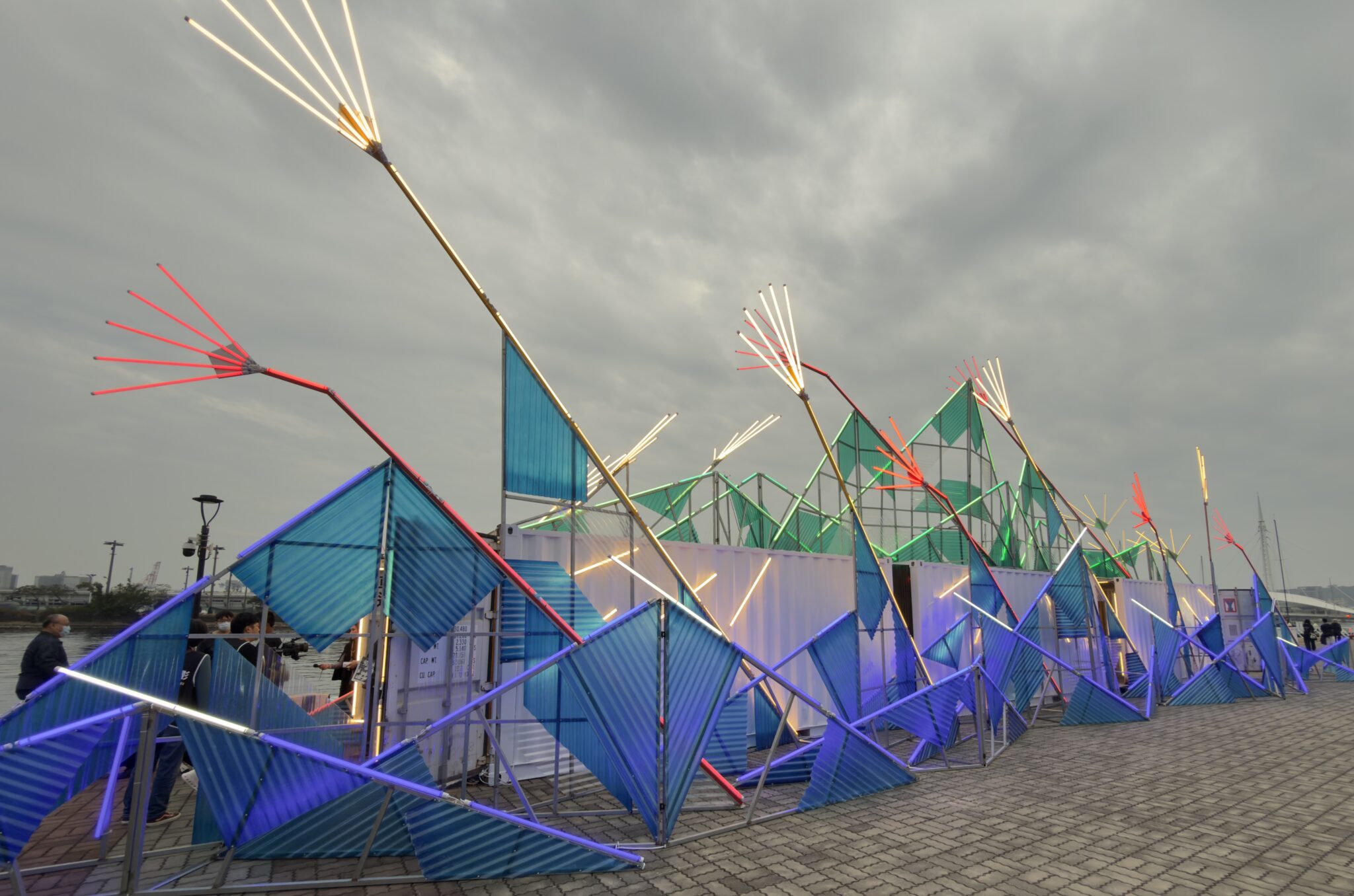 台日組合空間設計工作空-米索空間設計的作品《入港),以高雄港為靈感,藉由船頭劃破水面的意象,創造一段靠岸與穿越的空間體驗。來自法國、深耕於台灣的跨領域裝置藍術團隊hellobastworkshop創作的《K-950觀測艙》將廢棄保麗龍作為作品中的主角,呈現出詩意又帶有科幻感的場景,讓觀者在互動中反思物質循環、再生的可能性。丹麥藝術家Troels Steenholdt Heiredal何卓思的《貨櫃相機》,則翻轉貨櫃只是貨物運輪載體的印象,將其改造成為一個沉浸式的「相機」,讓觀眾可以親身參與、捕捉不同的城市風景。