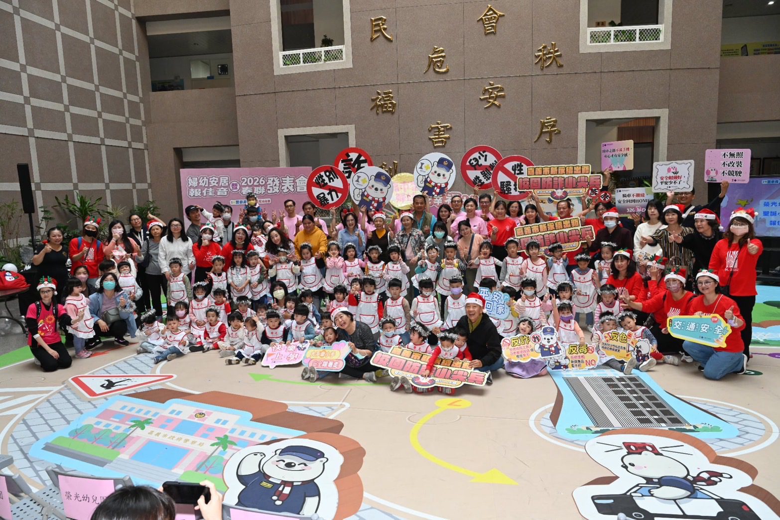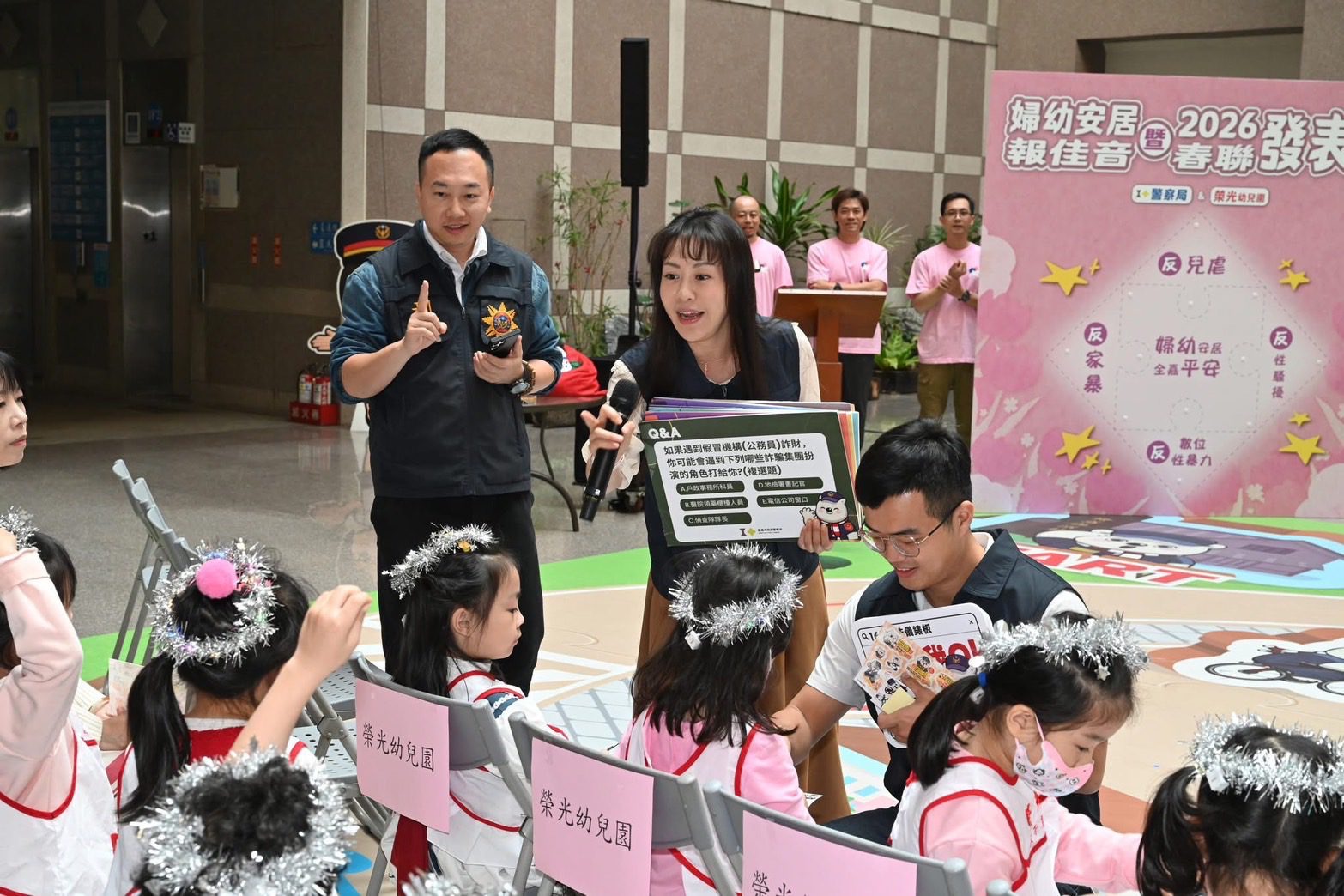 活動除透過榮光幼兒園孩子們純真的歌聲,傳遞平安與關愛外;警察局特別發表的2026「平安」春聯,正代表著嘉義市政府警察局整個團隊展望2026年的期許-警察守護嘉園、守護社區、守護婦幼、守護每一個家庭的用心與承諾,另外以可愛萌寵貓咪做為春聯主角,就是希望吸引小朋友的目光,讓孩子們更願意親近警察,認識警察。