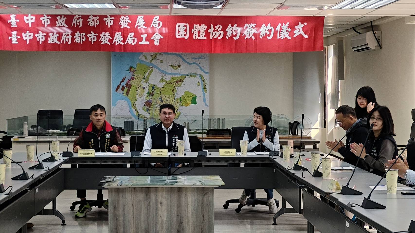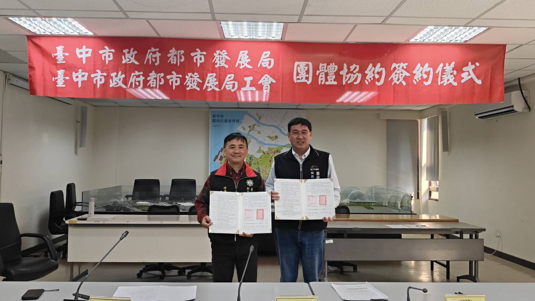 台中市政府都市發展局與其工會於今(5)日舉行團體協約簽約儀式,由局長李正偉與工會理事長廖國光代表簽署;勞工局長林淑媛及中市產業總工會理事長黃文峯到場見證,肯定工會長期推動勞資和諧之努力。